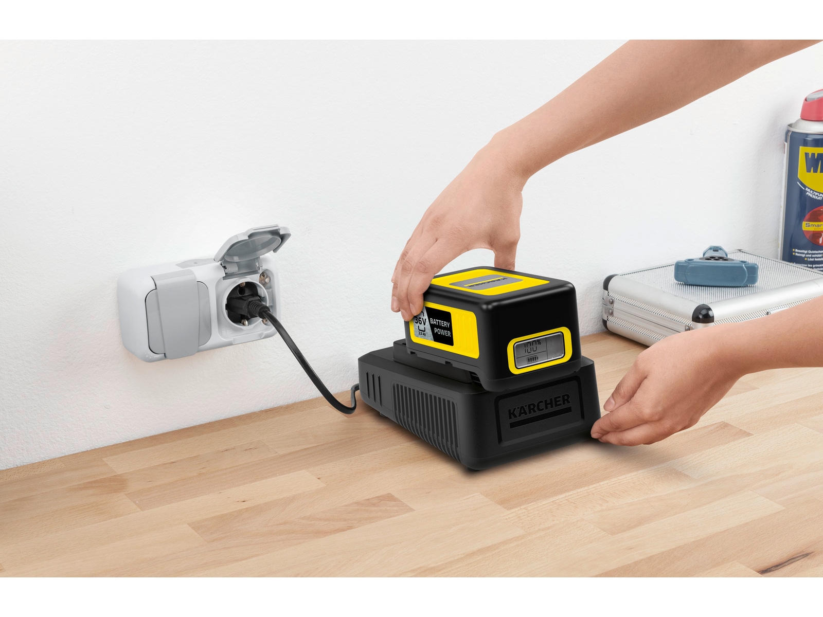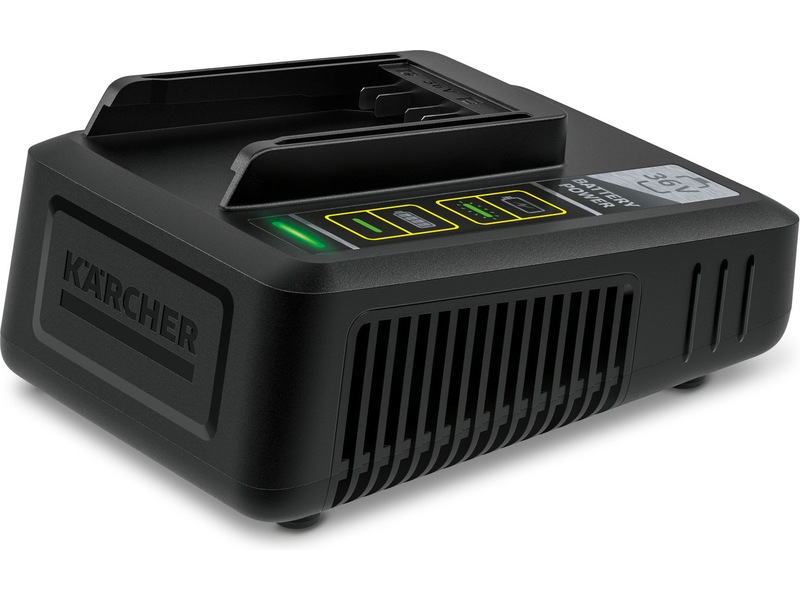 Snabbladdaren laddar 36V/2,5 Ah Lithium-ion batteriet till 80 % på bara 48 minuter. Den kan också användas för att ladda vilket annat 36V Lithium-ion batterie som helst från Kärchers 36V Battery Power-plattform.