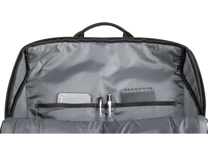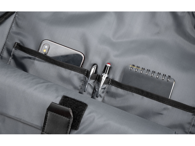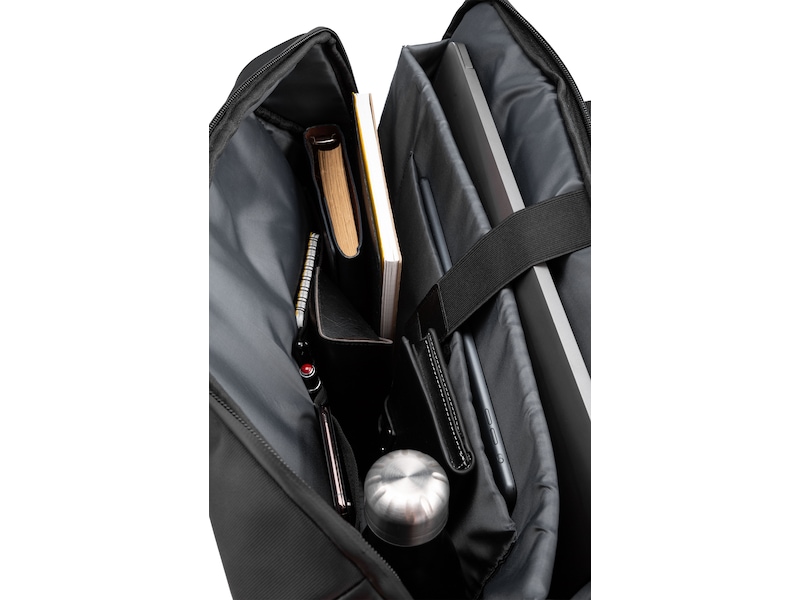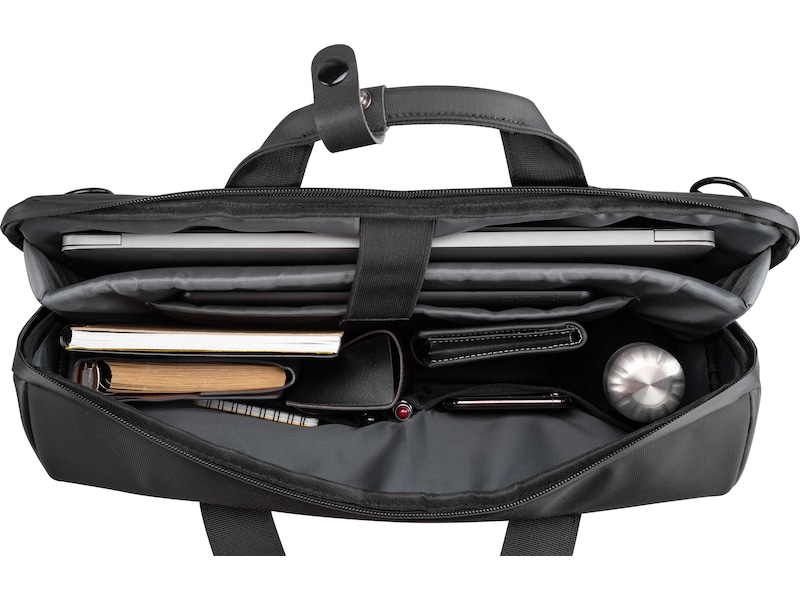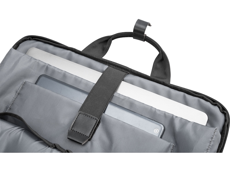 - Eget fack för laptops upp till 15,6" och fack för surfplattor upp till 11" betyder att du alltid vet var du har din utrustning när du behöver den, och en praktisk rem håller allt på plats. Dessutom finns det två praktiska fickor för mindre föremål och två utrymmen för pennor. På utsidan av väskan finns en stor ficka med dragkedja.