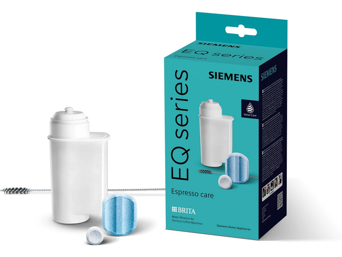 Siemens TZ80004B Espresso care set Siemens EQ. Espresso-skötselsetet säkerställer den bästa aromen och förlänger livslängden. Bästa aroman och optimal rengöring med rengöringstabletter i EQ-serien - originaltabletter från Siemens. Bästa skötseln genom smidigt kalkavlägsnande med avkalkningstabletter från EQ-serien - originaltabletter från Siemens. BRITA INTENZA original-vattenfilter - särskilt utvecklat för Siemens kaffemaskiner. Specialutvecklad för att säkerställa bästa doft och förlänga maskinens livslängd. Den till 100 % perfekta matchningen. 100 % njutning genom Value Care med originaltillbehör från Siemens. Funktioner Inkluderar alla komponenter som är nödvändiga för optimal skötsel och rengöring av helautomatiska espressomaskiner. Skötselsetets innehåll: 10 rengöringstabletter, 3 avkalkningstabletter, 1 BRITA Intenza-vattenfilter, 1 speciell rengöringsborste för mjölksugslang/-rör Lämplig för alla helautomatiska kaffemaskiner i EQ-serien samt inbyggda kaffestationer Säkerhetsdatablad