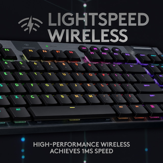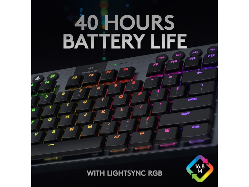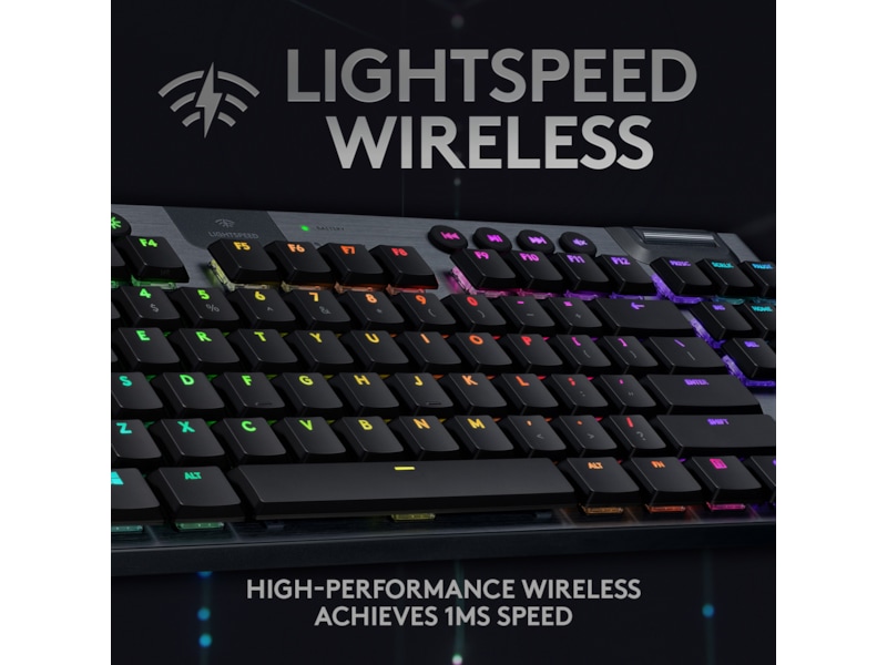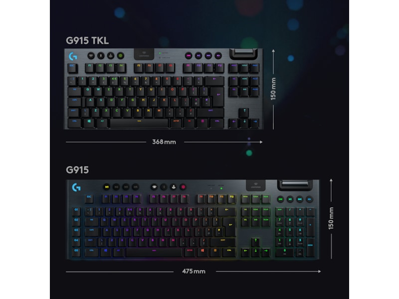 G915 TKL är en ny kategori av trådlösa mekaniska speltangentbord med tre val av diskreta GL-brytare och 1 ms trådlös LIGHTSPEED i proffsklass. Levererar 40 timmars oavbrutet spelande på en fulladdning. Helt anpassningsbar och avancerad LIGHTSYNC RGB- teknik för varje tangent för att synkronisera belysningen till innehållet.