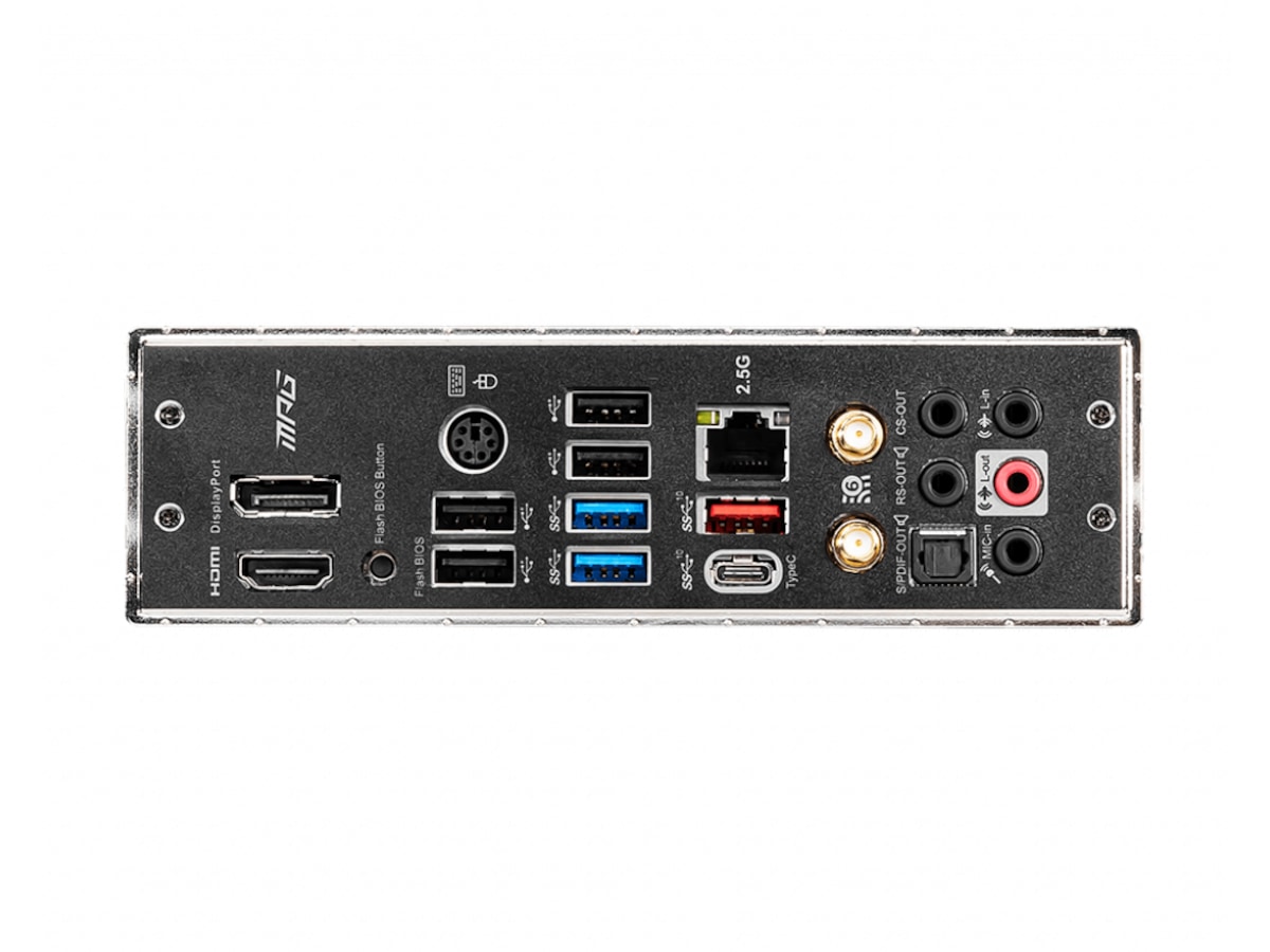 1 x ljudutgång (center/subwoofer) - mini-jack, 1 x PS/2-tangentbord/mus, 1 x HDMI, 1 x ljudingång - mini-jack, 2 x USB 3.2 Gen 1, 4 x USB 2.0, 1 x LAN (2.5Gigabit Ethernet), 1 x TOSLINK, 1 x mikrofon - mini-jack, 1 x ljudutgång - mini-jack, 1 x ljudutgång (bakre) - mini-jack, 1 x USB-C Gen2, 1 x DisplayPort, 1 x USB 3.2 Gen 2