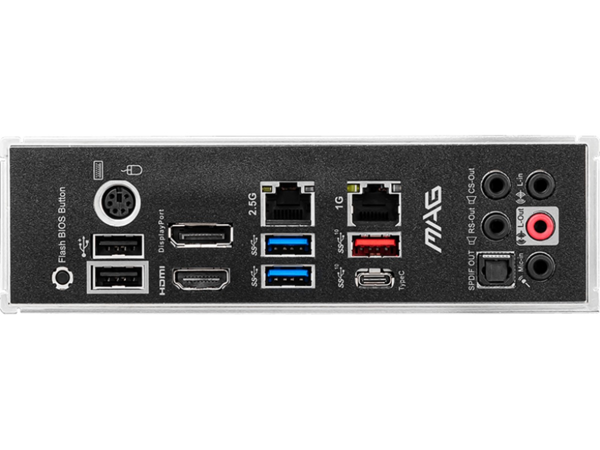 2 x USB 3.2 Gen 1, 1 x mikrofon - mini-jack, 1 x ljudutgång - mini-jack, 1 x ljudingång - mini-jack, 1 x PS/2-tangentbord/mus, 1 x USB-C Gen2, 1 x DisplayPort, 2 x USB 2.0, 1 x ljudutgång (bakre) - mini-jack, 1 x TOSLINK, 1 x ljudutgång (center/subwoofer) - mini-jack, 1 x LAN (2.5Gigabit Ethernet), 1 x HDMI, 1 x LAN (Gigabit Ethernet), 1 x USB 3.2 Gen 2