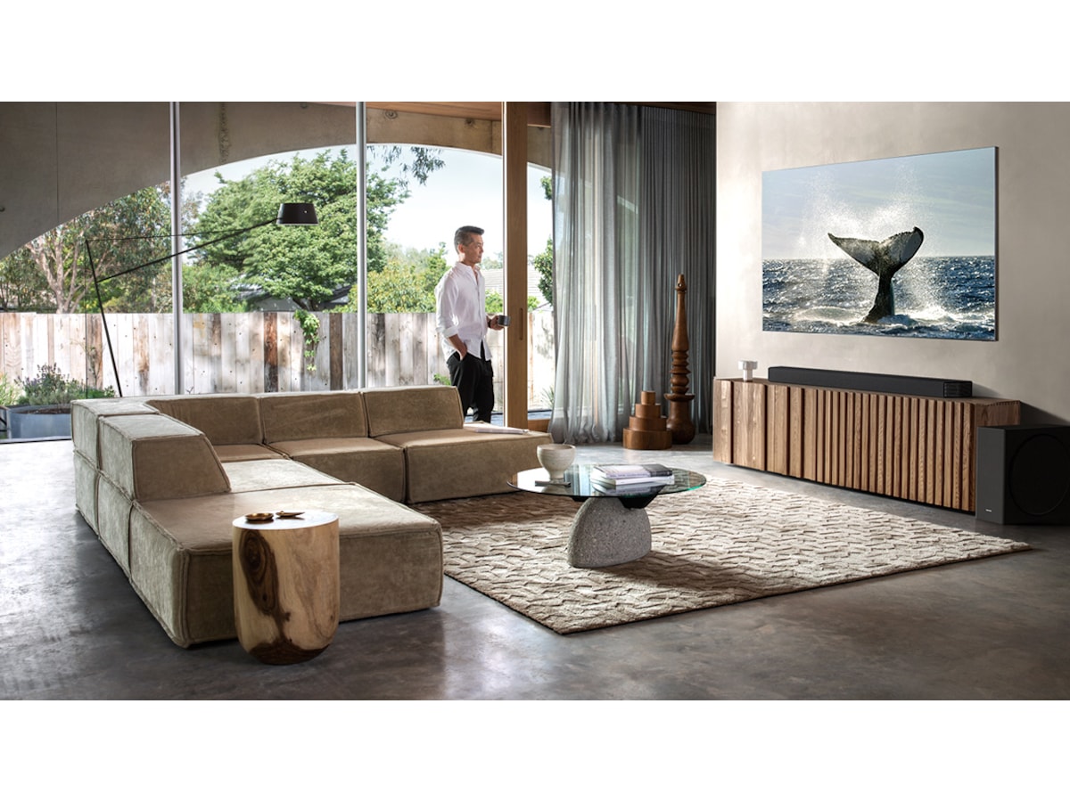 Soundbar Q900T synkroniseras med Samsung TV:n och tillsammans skapar de ett helt uppslukande ljud. Den kombinerar och förstärker ljudet genom fram- och sidohögtalarna, de uppåtvända högtalarna, TV-högtalarna och sidohögtalarna, och ger en akustisk känsla på en helt ny nivå.