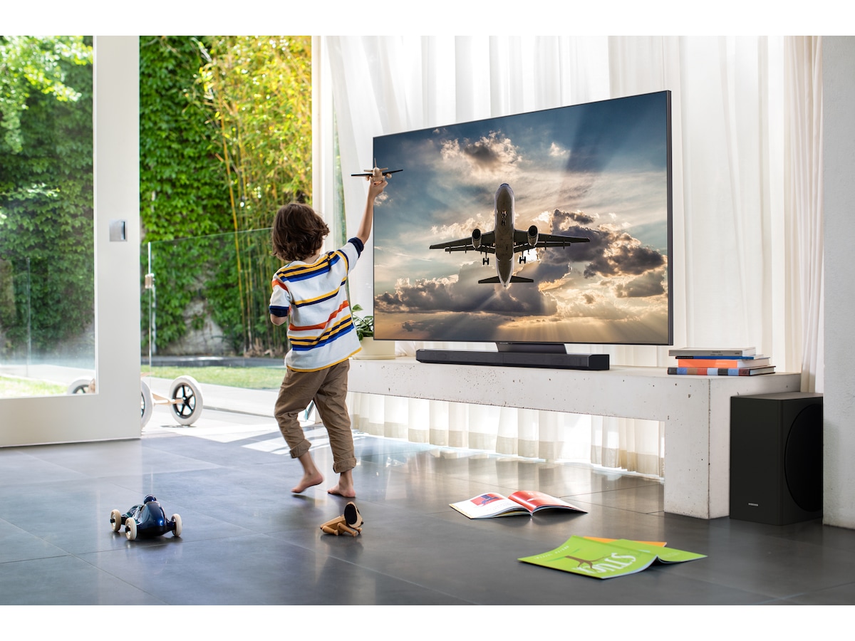 Nu kan en soundbar använda TV:ns högtalare för ett ännu bättre ljud. QLEDs två topphögtalare i kombination med de framåt-/sido- och uppåtriktade högtalarna på soundbaren skapar en komplett surroundupplevelse.