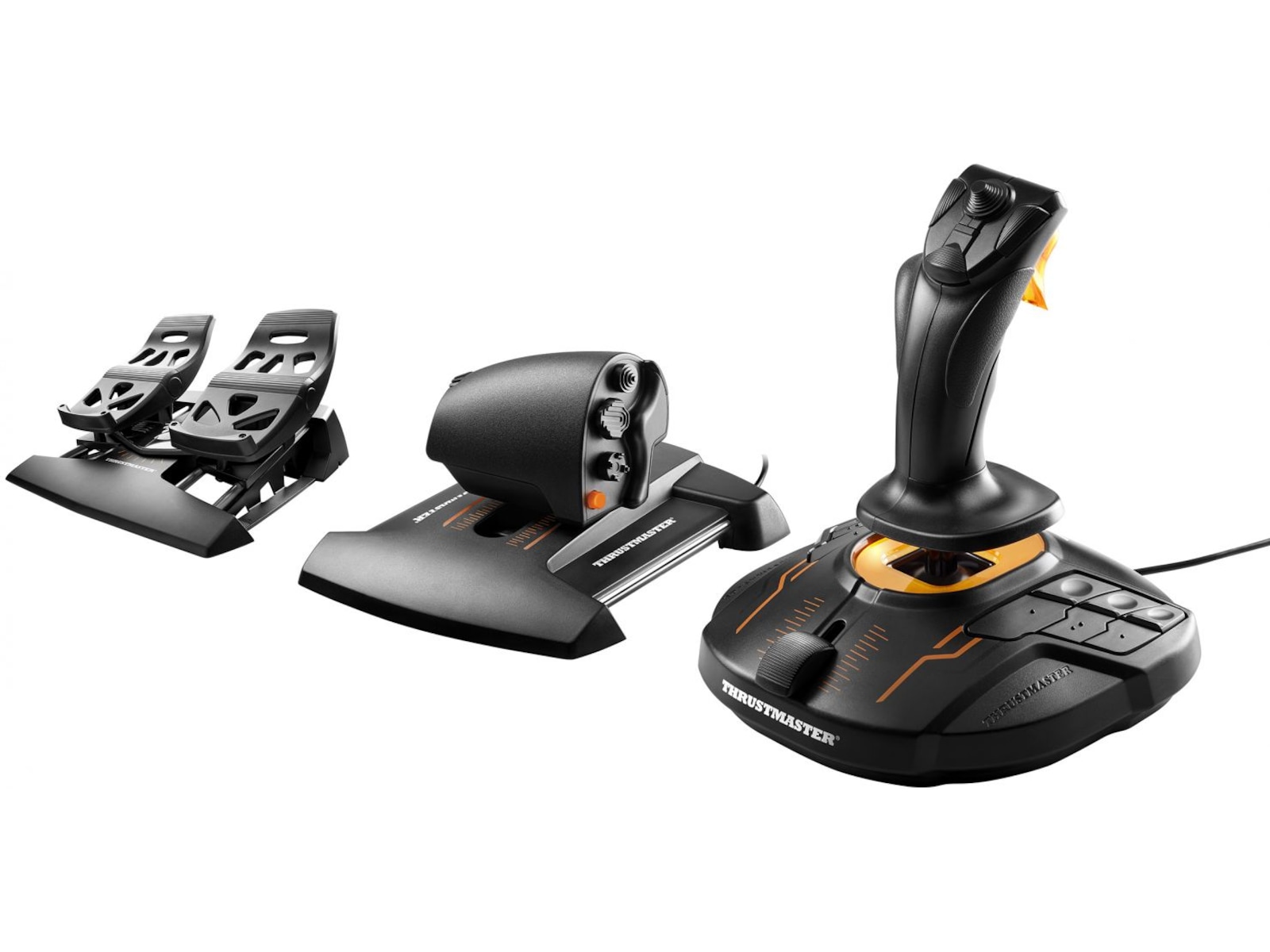 T.16000M FCS (Flight Control System) flight stick featuring H.E.A.R.T magnetic precision technology + TWCS (Thrustmaster Weapon Control System) throttle + TFRP (Thrustmaster Flight Rudder Pedals) both featuring S.M.A.R.T technology