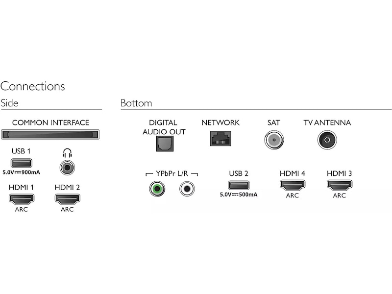 Anslutningstyp Hörlurar - sida, LAN - nedre del, Digital ljudutgång (optisk) - nedre del, 2 x HDMI - sida, Komponentvideo/ljudingång - nedre del, USB - nedre del, 2 x HDMI - nedre del, USB - sida