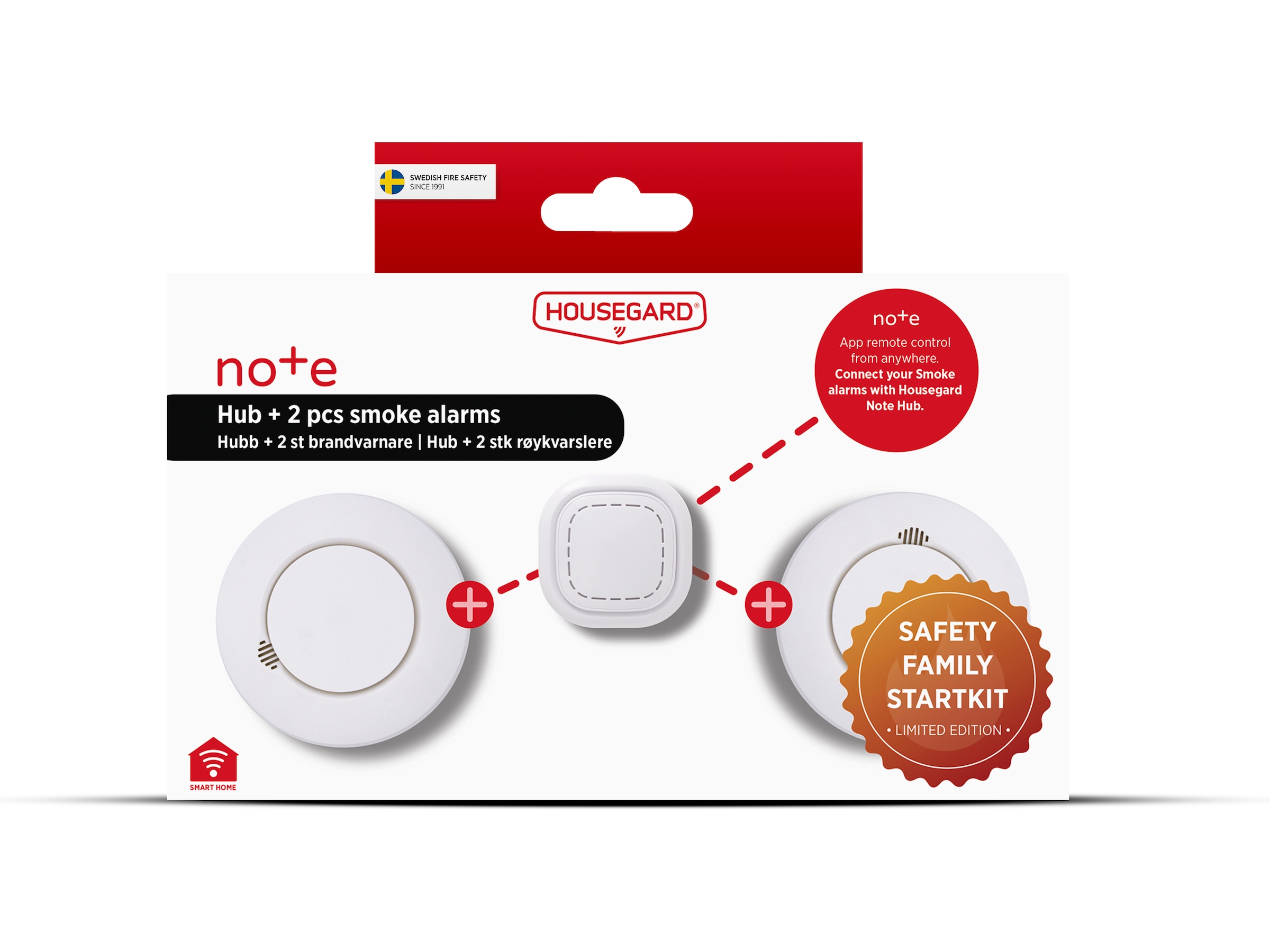 Housegard Note Family Startkit är en reklamprodukt med ett mycket attraktivt pris som innehåller 2 smarta brandvarnare och en hubb.