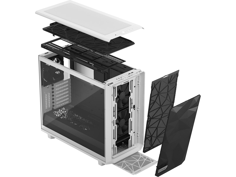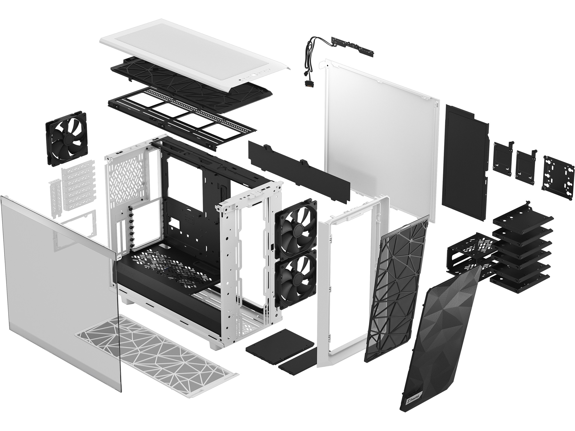 Meshify 2 är ett högpresterande chassi med en djärv, smyginspirerad estetik. Den slående exteriören består av en bultfri, helt avtagbar övre del som ger utmärkt inre åtkomst och en helt nydesignad front med USB-C, gångjärnspanel och avtagbart nylonfilter. Den flexibla interiören med dubbel layout stödjer stora lagringsytor och inställningar för flera radiatorer, vilket gör kylningen enkel och okomplicerad.