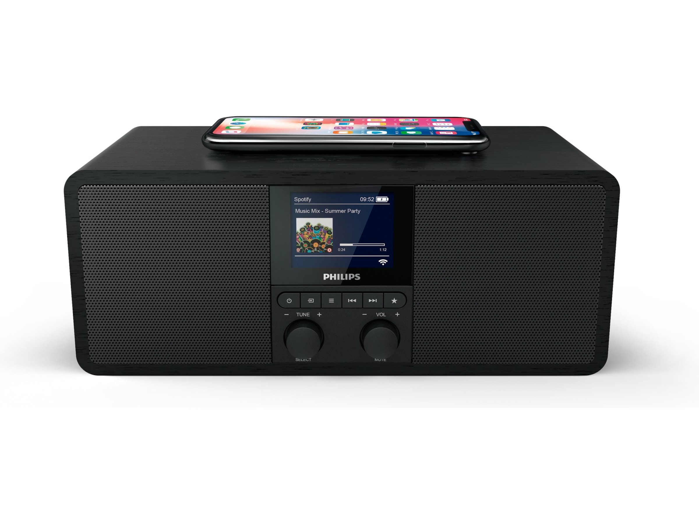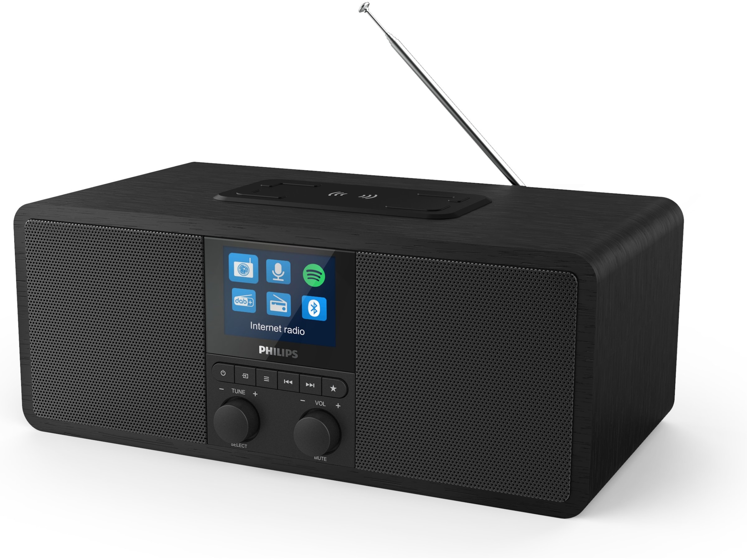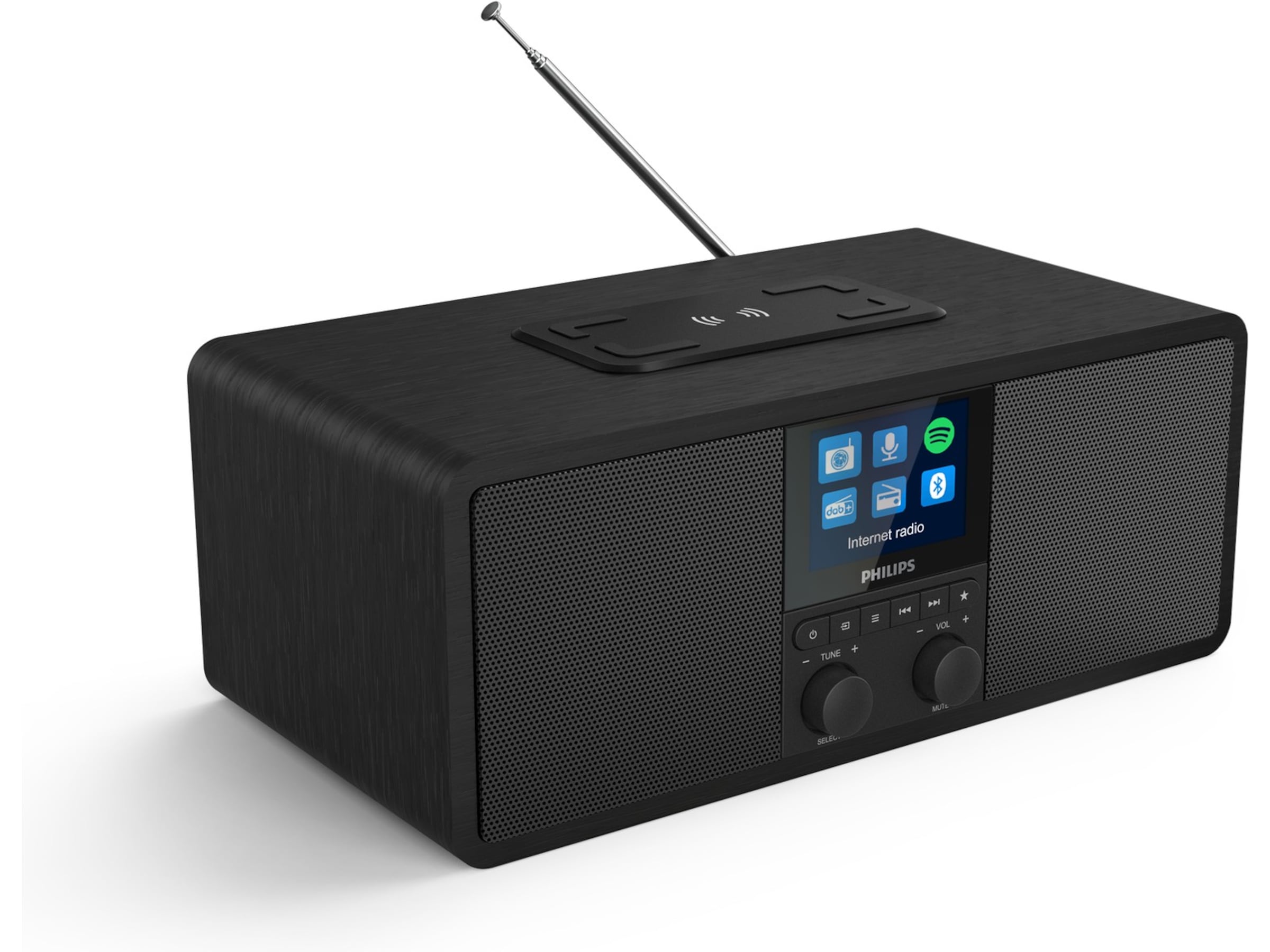 Det mattsvarta trähöljet omger en stor, högblank färgskärm och ett svart högtalargaller i metall. Skärmen visar albumomslag och låtinformation från Spotify Connect, och stationslogotyper när du använder webbradio eller DAB.