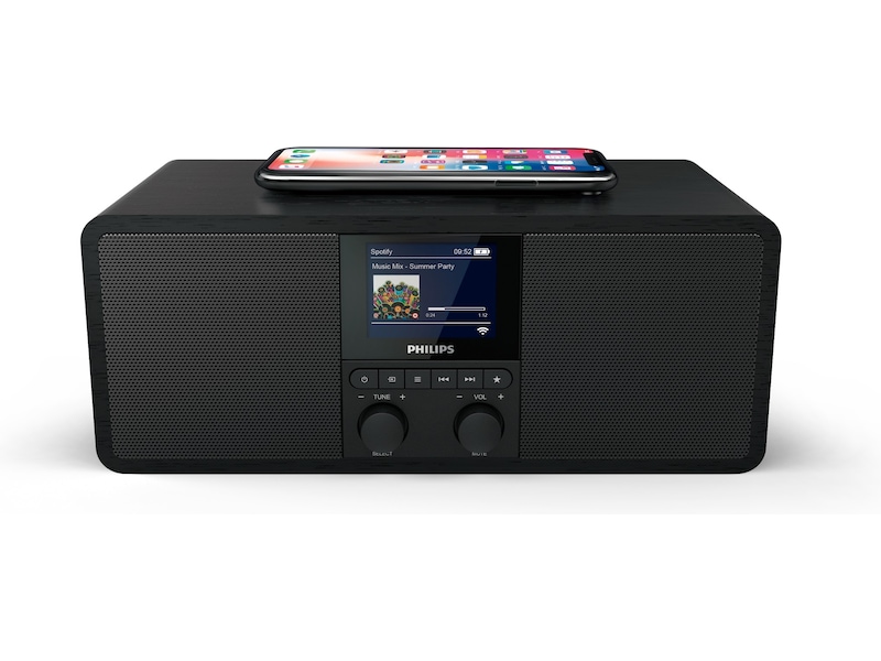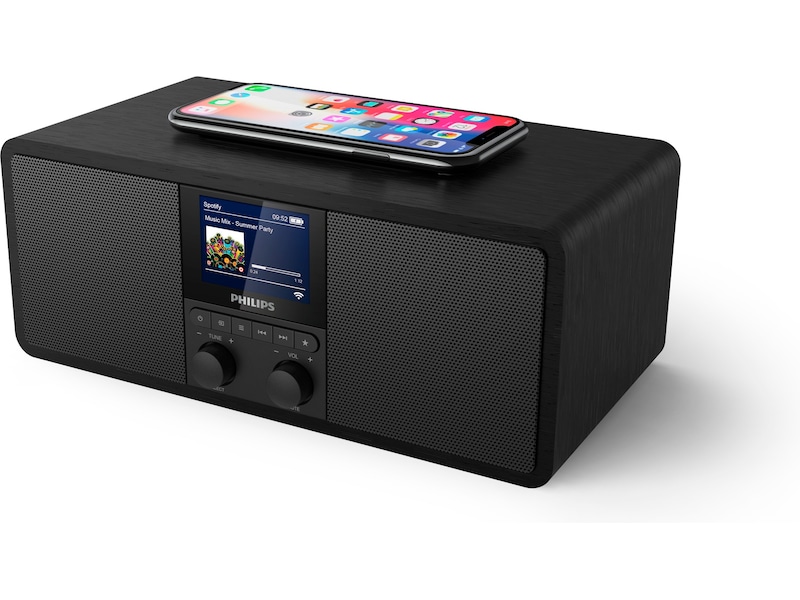 Det finns en trådlös Qi-laddningsplatta ovanpå radion. För äldre telefoner finns en USB-laddningsport. Den har en stor och tydlig digital tidsvisning och knappkontroller på frontpanelen.