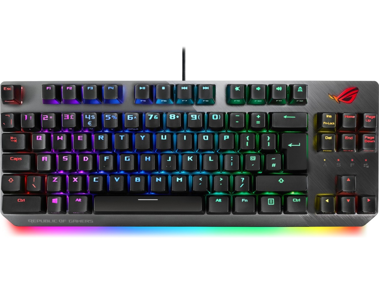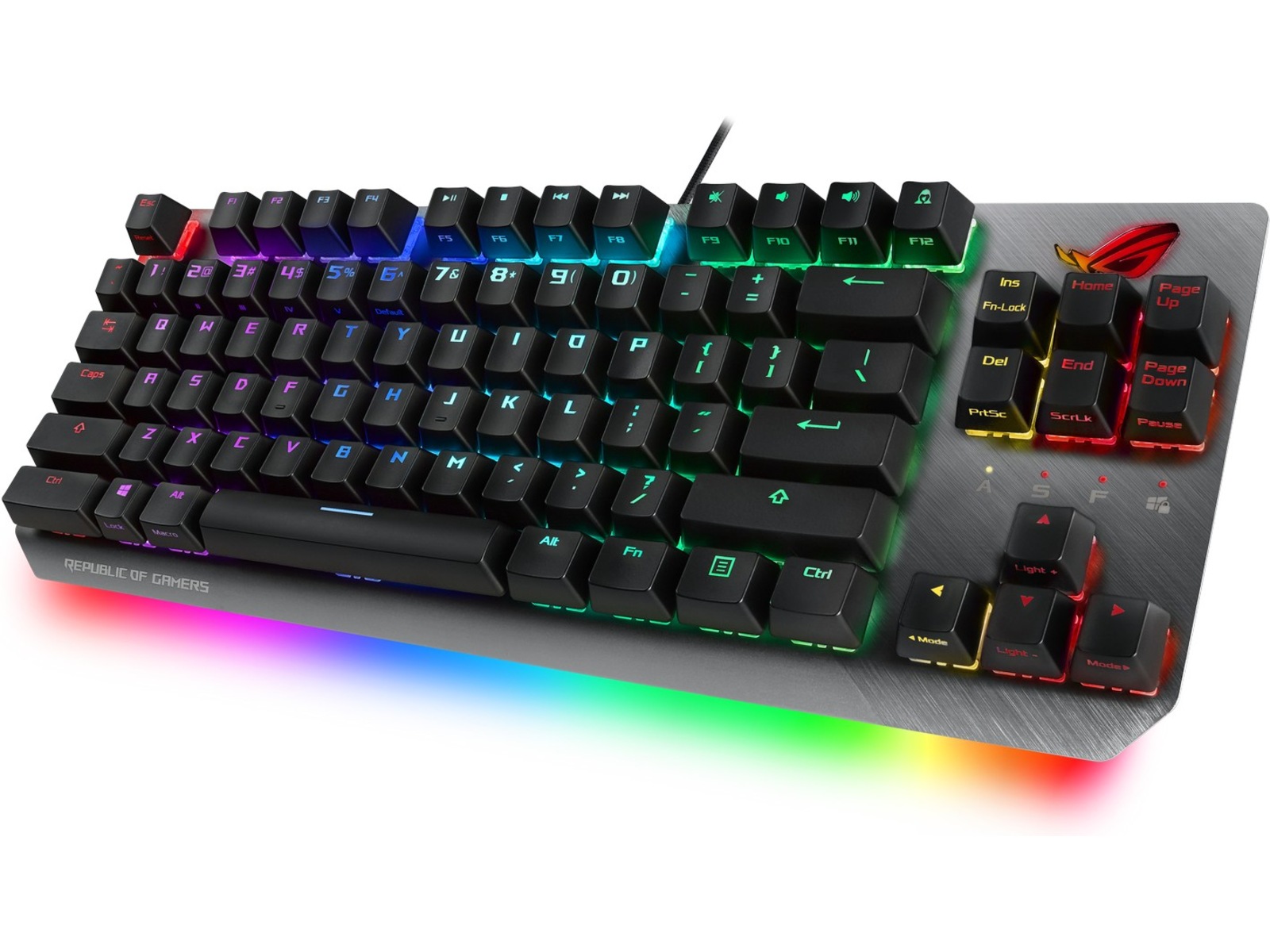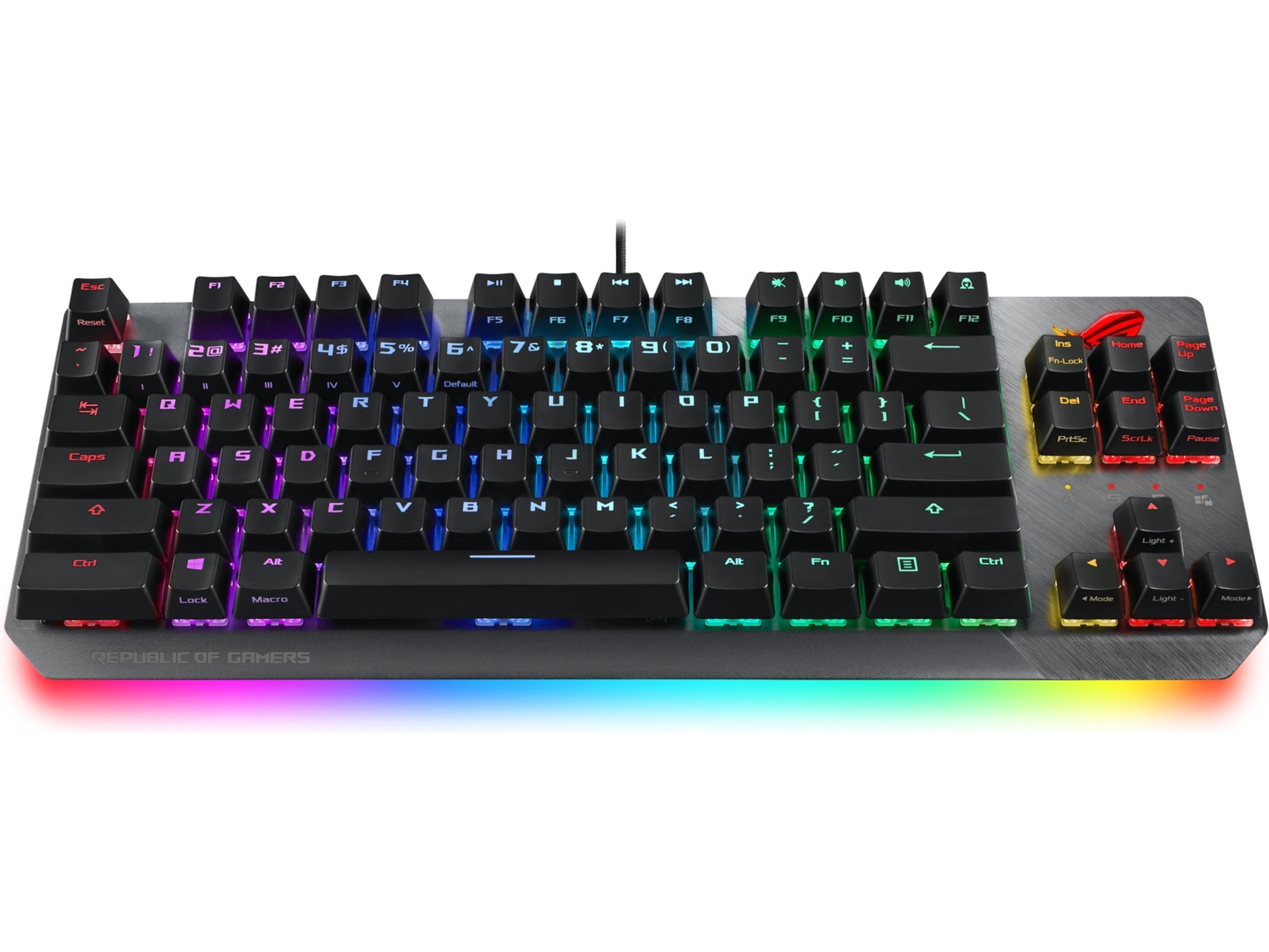 ROG Strix Scope TKL är full med pulserande RGB-belysning som du kan styra. Det finns en individuell RGB LED under varje tangent, RGB-låsindikatorer och en RGB ROG-logga. Det projicerar till och med en snygg RGB-glöd underifrån och sprider ut ljuset bortom tangentbordet. Med Aura Sync kan du styra hela färgspektrat och en serie dynamiska belysningseffekter för att skapa ett helt system som är unikt för dig. Det är även enkelt att synka ROG Strix Scope TKL belysning med det omfattande Aura-ekosystemet, så det är lätt att bygga en spelmiljö som verkligen glänser.