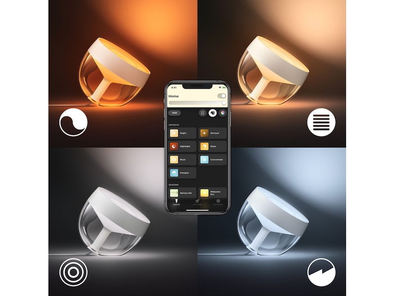 Gör din dag enklare och bekvämare med fyra ljusinställningar som är inställda speciellt för dagliga sysslor: Energize, Concentrate, Read och Relax. De två svala nyanserna Energize och Concentrate hjälper dig att komma igång på morgonen eller hålla fokus, medan de varma inställningarna Read och Relax är perfekta när du vill njuta av en bra bok eller koppla av.