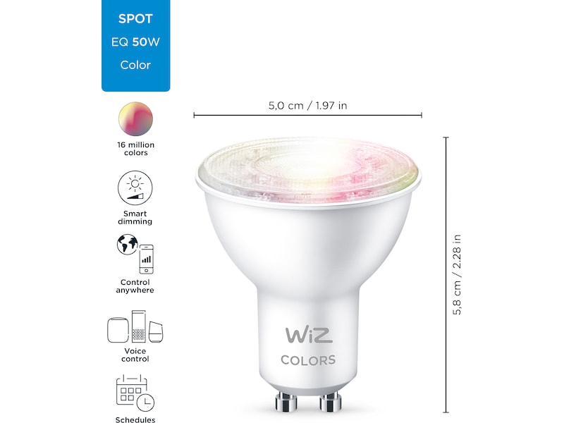 Få ditt hem att skina med strålande färgglad stämningsbelysning med serien av WiZ full color smarta ljuskällor. Med denna GU10-spot kan dina spotlights (infällda och utanpåliggande) lysa i 16 miljoner färger och ge dig precis den ljustemperatur och högkvalitativa LED-belysning som du önskar och förtjänar.