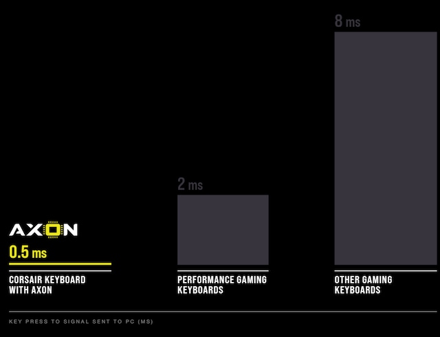 CORSAIR AXON Hyper-Processing Technology möjliggör CORSAIRs mest avancerade speltangentbordupplevelse, genom att till dina ingångar leverera upp till 4 gånger snabbare inbyggd 4 000Hz hyperpolling och 4 000Hz tangentskanning, samtidigt som 20-skikts ljuseffekter skapas.