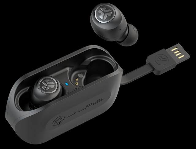 INKLUDERAR:GO Air Earbuds, laddningsfodral med integrerad laddningskabel, 3 uppsättningar gelproppar: Liten, Medium, Stor, med två års JLab-garanti.
