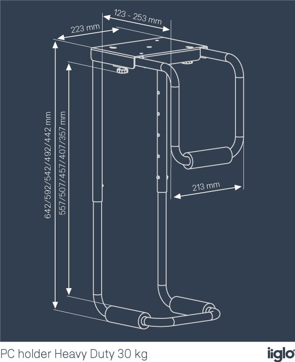 Detta är en solid PC-hållare som höjer din dator ovanför golvet och som monteras säkert under skrivbordet. Njut av en kabelfri övergång; skydda din dator genom att få upp den från golvet och bort från damm och smuts, vilket de flesta PC-hållare gör - men vår Heavy Duty-serie kan hålla datorer på upp till 30 kg. Den höjd- och breddjusterbara designen passar de flesta datorchassin.
