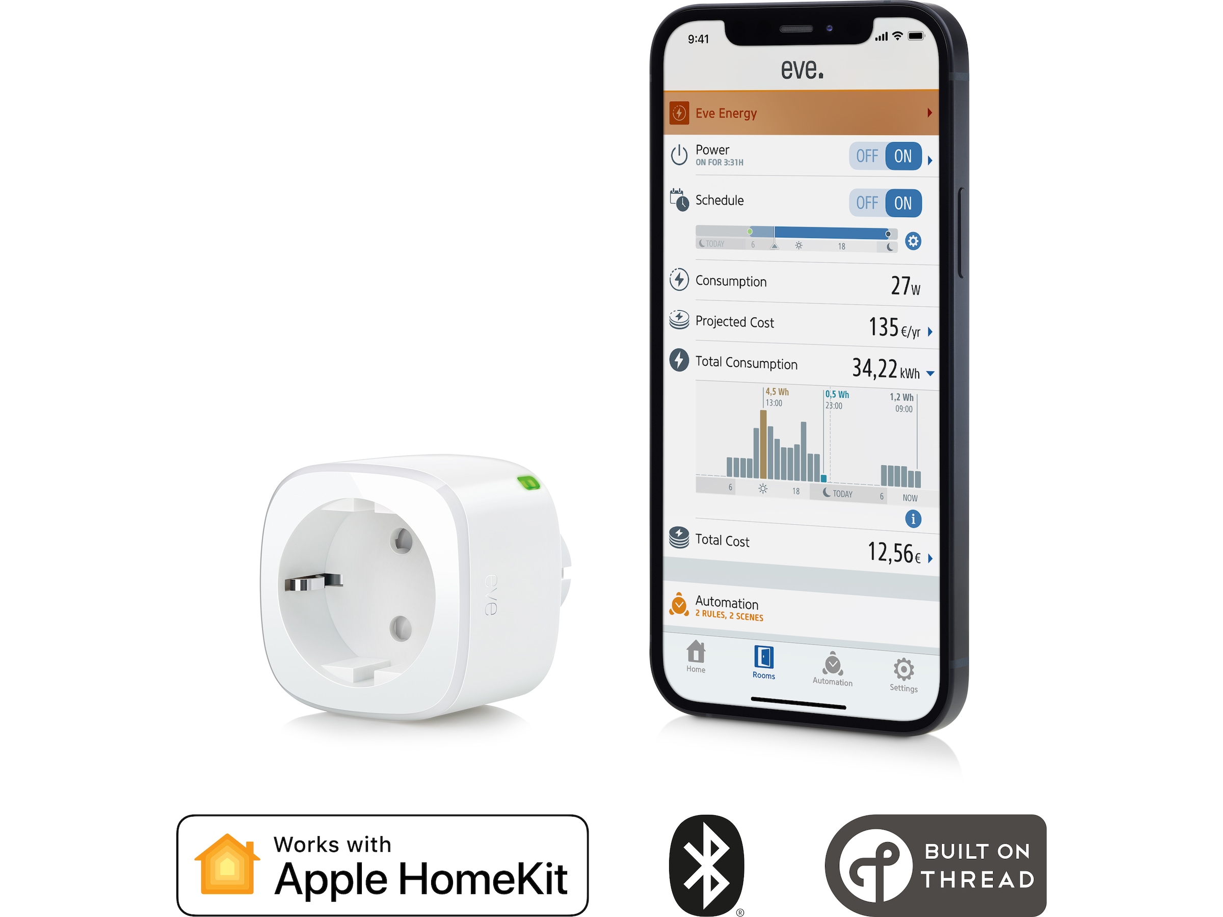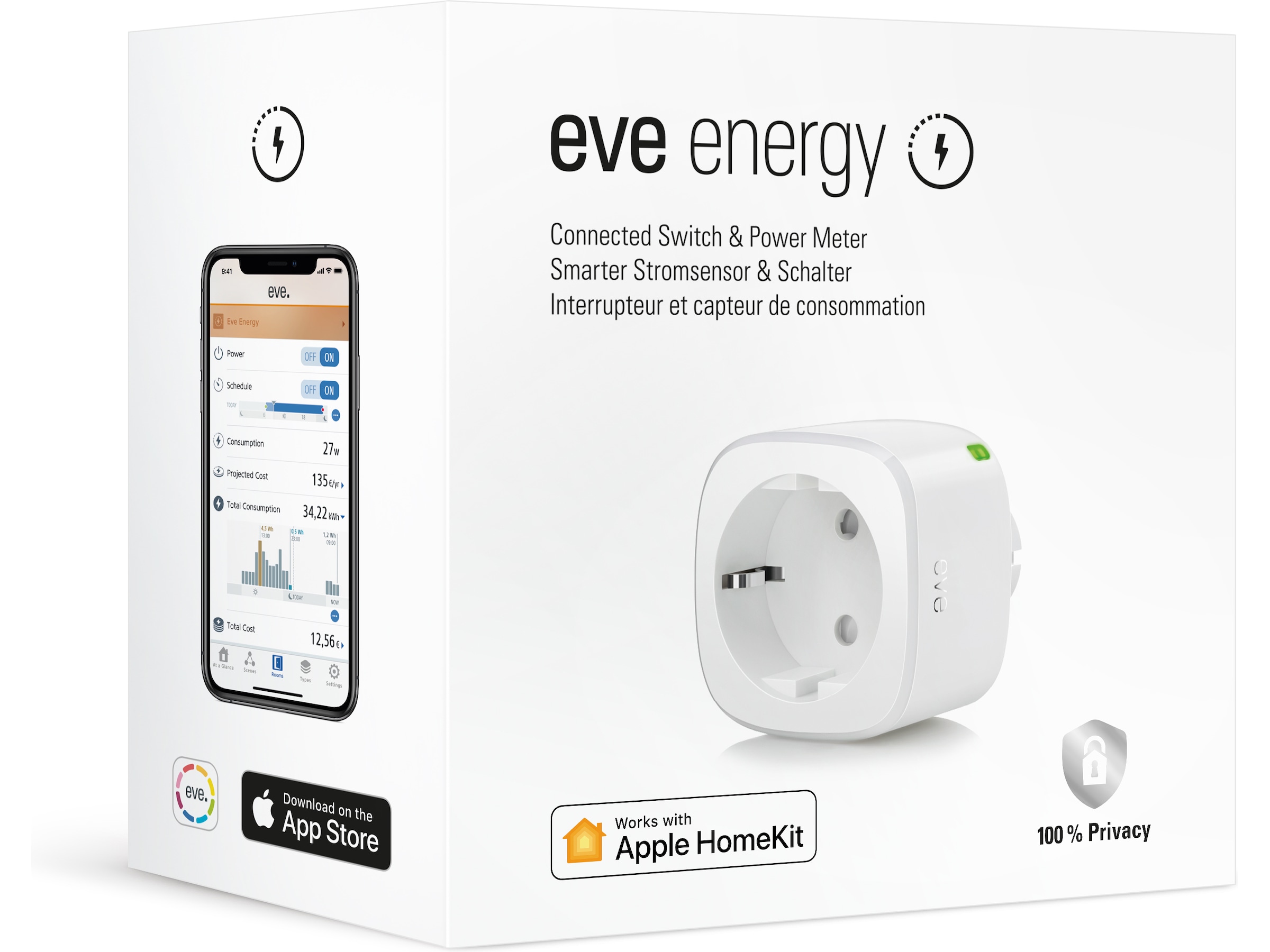Med Apple HomeKit-teknik och TÜV-certifiering erbjuder Eve Energy enastående användarvänlighet och avancerad säkerhet, är snabb och enkel att installera och behöver ingen brygga. Och det bästa med alla Eve-tillbehör är hur de skyddar din integritet: Eve sparar inte dina personuppgifter och det finns inget Eve-moln, så dina uppgifter kommer inte att försvinna eller göras tillgängliga för tredje part.