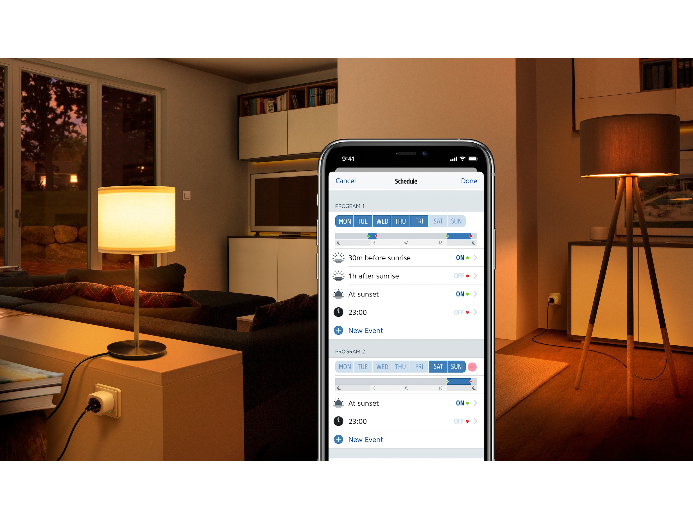 Styr dina lampor och apparater med ett enkelt tryck eller genom att fråga Siri. Eller sätt enkelt upp scheman som sätter dina apparater på autopilot och slår på och stänger av golvlampor, avfuktare och många andra enheter oberoende av din iPhone eller internetanslutning. Med Apple TV eller HomePod som ditt hemnav kan du också komma åt dina tillbehör när du är på språng, styra dem automatiskt baserat på om någon lämnar eller kommer hem och lägga till automatiseringar som fungerar med andra HomeKit-aktiverade tillbehör.