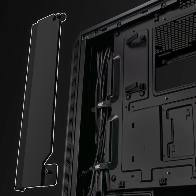 Den enkla invändiga layouten gör byggprocessen enkel och tillfredsställande. Det är lätt att dölja kablar och lägga dem snyggt i chassit. På baksidan av chassit finns det gott om utrymme och ett intuitivt skydd för just detta ändamål. Det är därmed enkelt att undvika kabeltrassel! Längst ner i chassit finns ett dammfilter, som är otroligt lätt att dra ut för att rengöra. Det medföljer också en påse med monteringsmaterial samt en justerbar grafikkortshållare med utbytbara dynor.