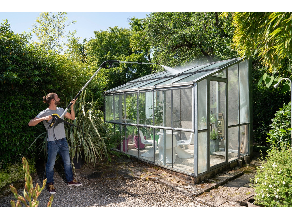 Det 180° justerbara gångjärnet är en annan fördel och gör det möjligt att rengöra växthus, sluttande tak och carportar. Det är enkelt att använda den praktiska teleskopmekanismen som utlöses med ett knapptryck.
