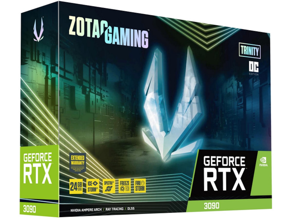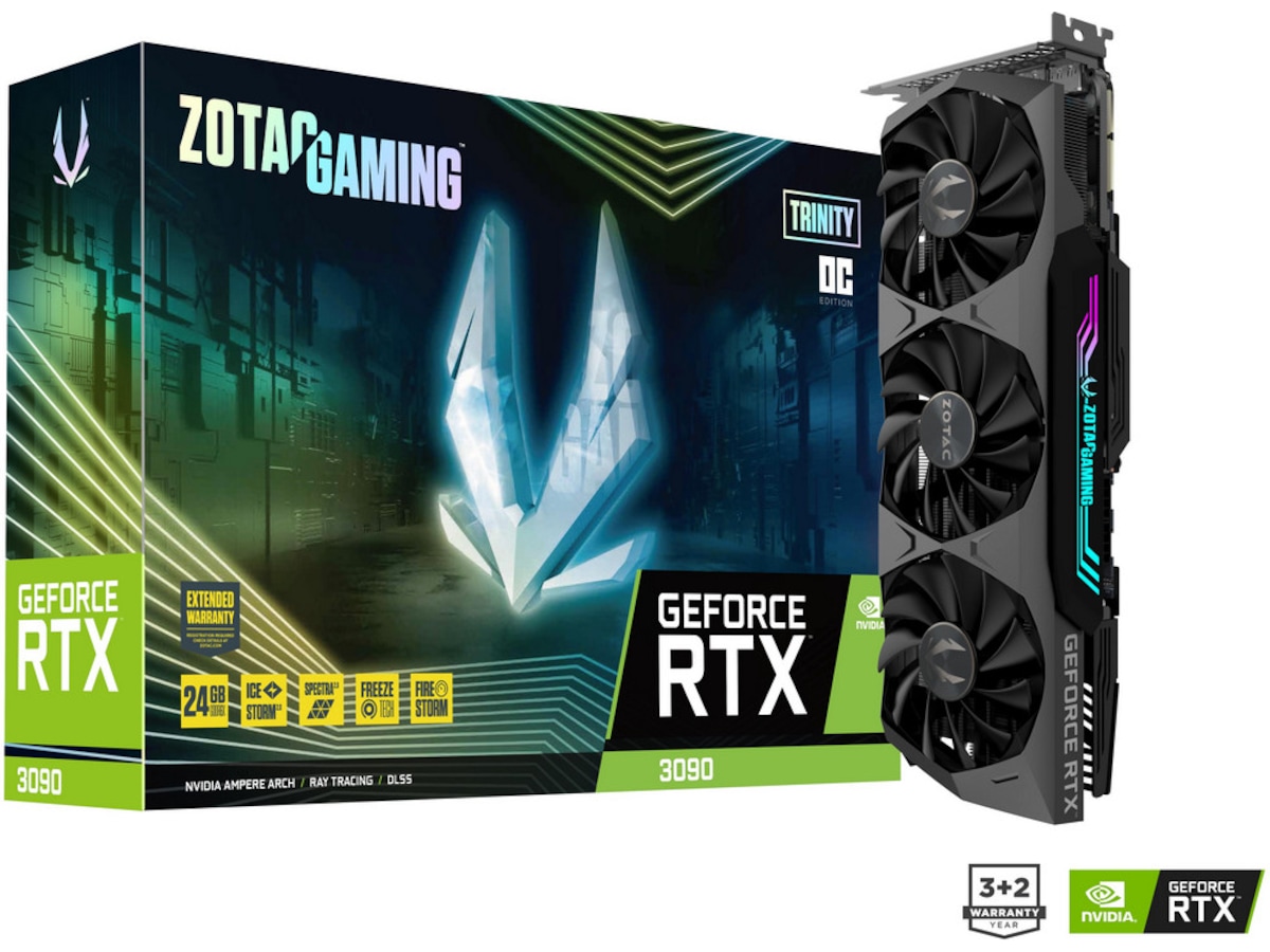 ZOTAC GeForce RTX 3090 Trinity OC Få fler fördelar med ZOTAC GAMING GeForce RTX™ 30-serien, baserad på NVIDIA Ampere-arkitekturen. ZOTAC GAMING GeForce RTX 3090 Trinity OC är byggd med förbättrade RT Cores och Tensor Cores, nya strömmande multiprocessorer och supersnabbt GDDR6X-minne och ger upphov till en förstärkt spelupplevelse med ultragrafisk verklighet.