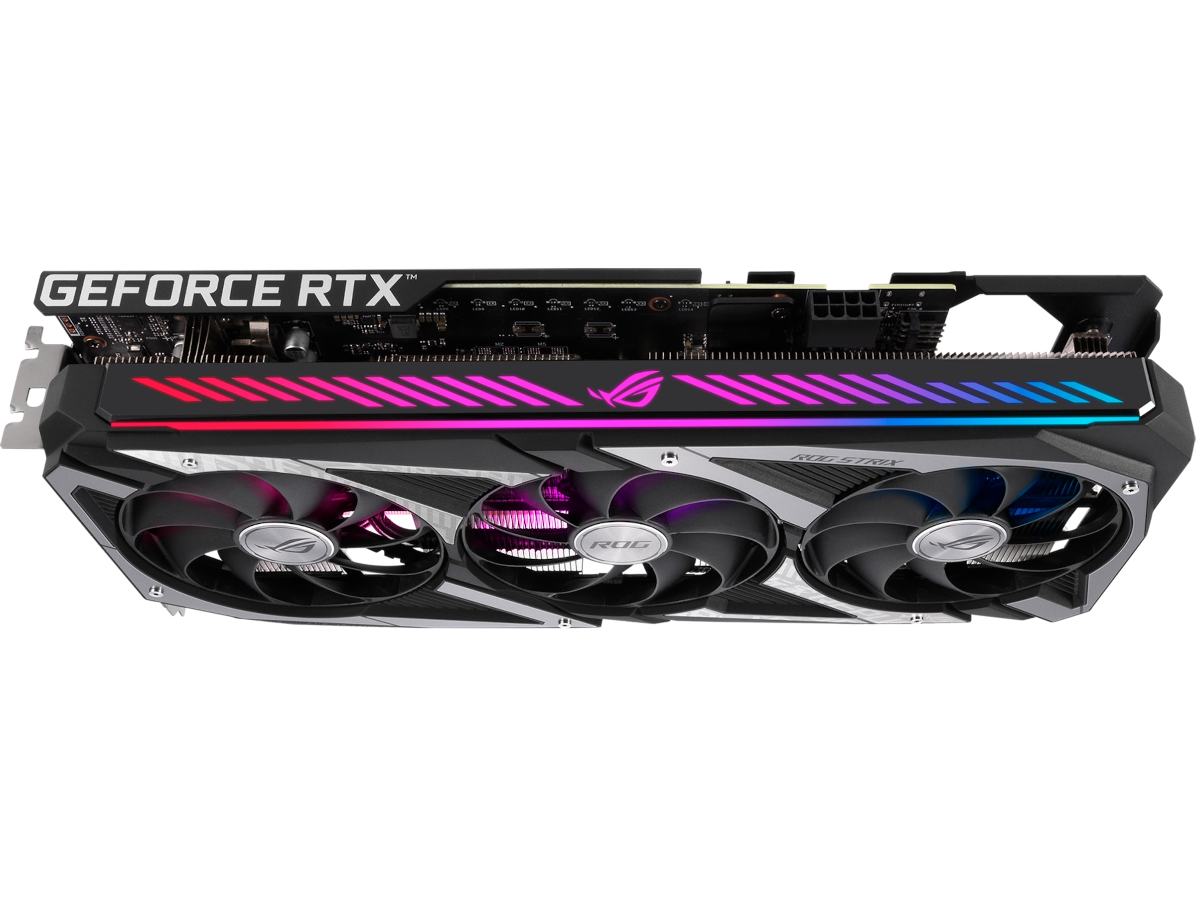 Framsidan på grafikkortet har fått en extra noggrann översyn då det är den mest synliga delen i de flesta datorkonfigurationer. Grafikkortet har utrustats med ny RGB-belysning som kan konfigureras med Armoury Crate för att skapa ett sammanhängande utseende med andra ROG-komponenter. För att möta strömkraven för GeForce RTX 3060 finns en 8-pin strömkontak och en integrerad krets för övervakning av nätaggregatets spänning. Kretsen är snabb nog att fånga spikar som skulle kunna få spänningen att sjunka för lågt. Om det ändå skulle hända, tänds en röd LED-lampa för att indikera att det är problem med strömförsörjningen.