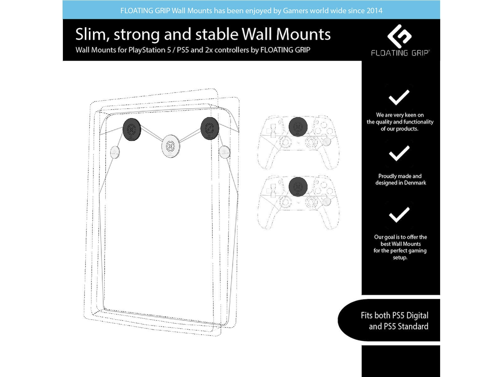Visa, lagra eller dölj din PlayStation 5 (PS5) och styrenheterna på din vägg genom FLOATING GRIP-väggfästet