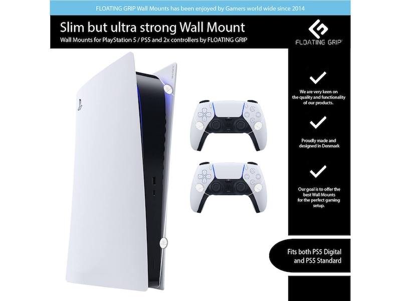 Inkluderar:1x FLOATING GRIP®-väggfäste för PS5 (passar både digital- och standardversion) + 2x FLOATING GRIP®-väggfästen för PlayStation-styrenheter