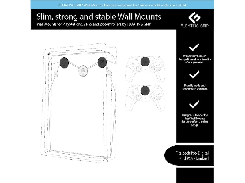 Vi hoppas att du kommer att njuta av ditt nya FLOATING GRIP-väggfäste för ditt PlayStation 5 (PS5) och styrenheterna.