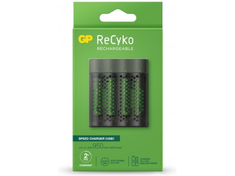Den här mångsidiga laddaren fungerar via USB eller en GP ReCyko-laddningsdocka (speciellt utvecklad för ReCyko-laddarmodeller B421, M451 och P461). Du är välutrustad med denna optimala laddningslösning, där fyra AAA 950mAh uppladdningsbara batterier ingår.