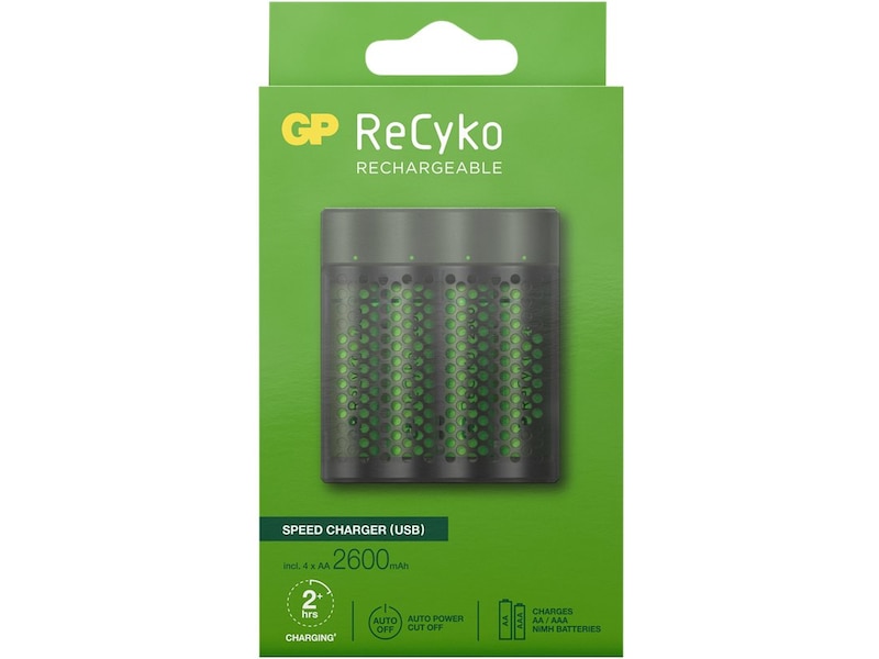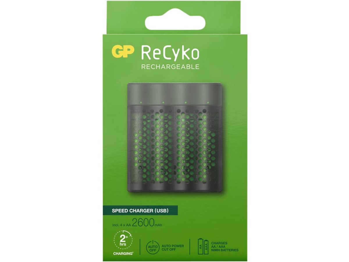 Den här mångsidiga laddaren fungerar via USB eller en GP ReCyko-laddningsdocka (speciellt utvecklad för ReCyko-laddarmodeller B421, M451 och P461). Du är välutrustad med denna optimala laddningslösning där fyra AAA 950mAh uppladdningsbara batterier ingår.