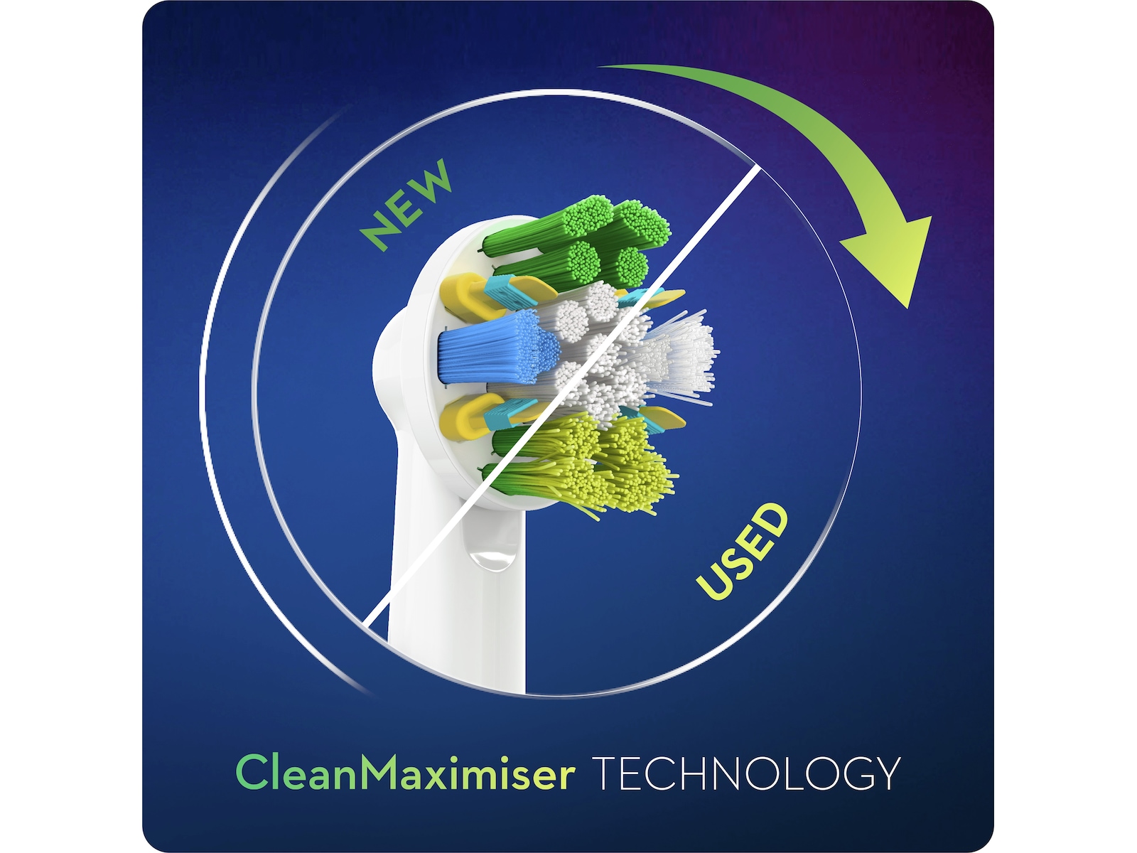 Oral-B:s förbättrade CrossAction borsthuvuden har utvecklats med CleanMaximiser-teknologi som ändrar färgen på borststråna från grönt till gult när de ska bytas, för optimal prestanda och bästa rengöring.