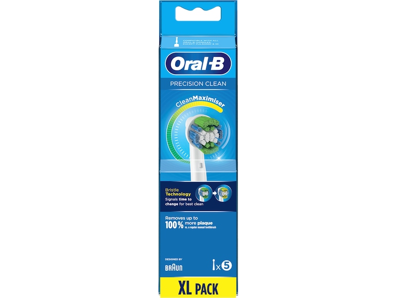 Oral-B:s förbättrade Precision Clean-borsthuvuden har utvecklats med CleanMaximiser-teknologi som ändrar färgen på borststråna från grönt till gult när de ska bytas, för optimal prestanda och bästa rengöring.