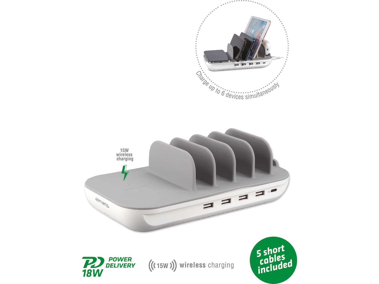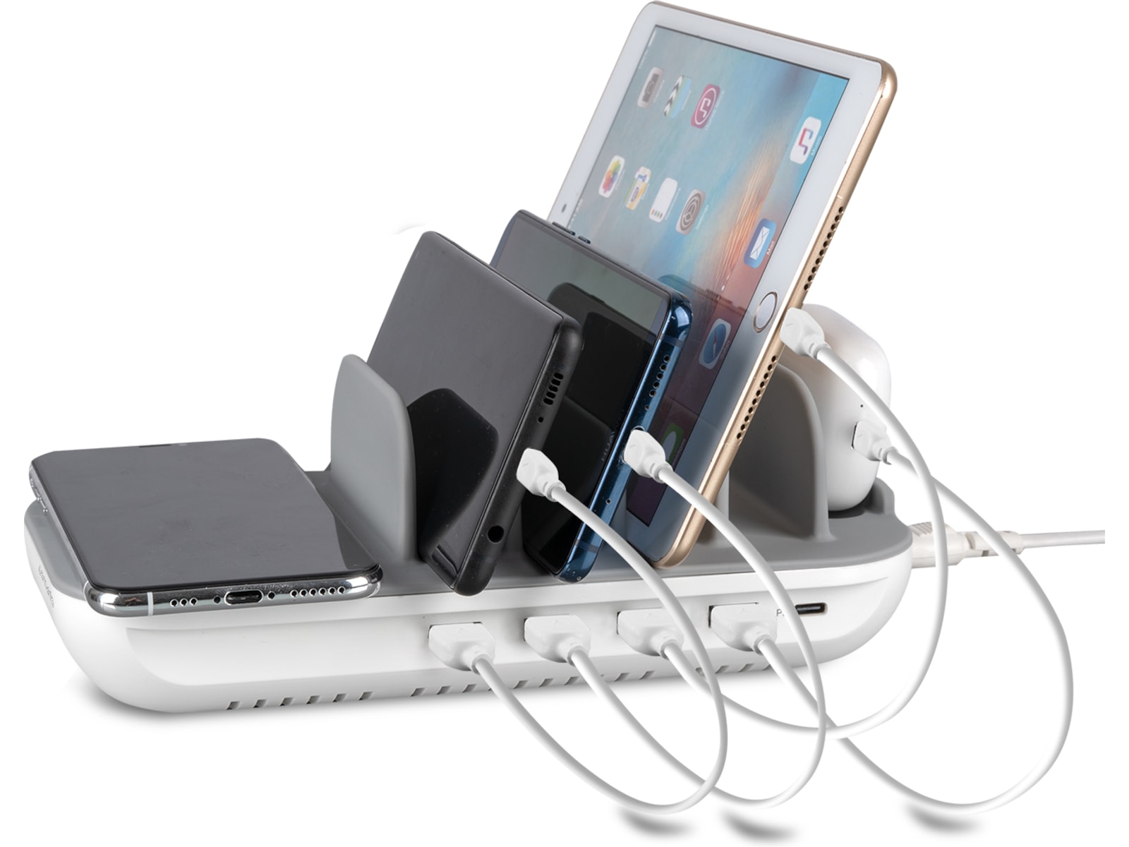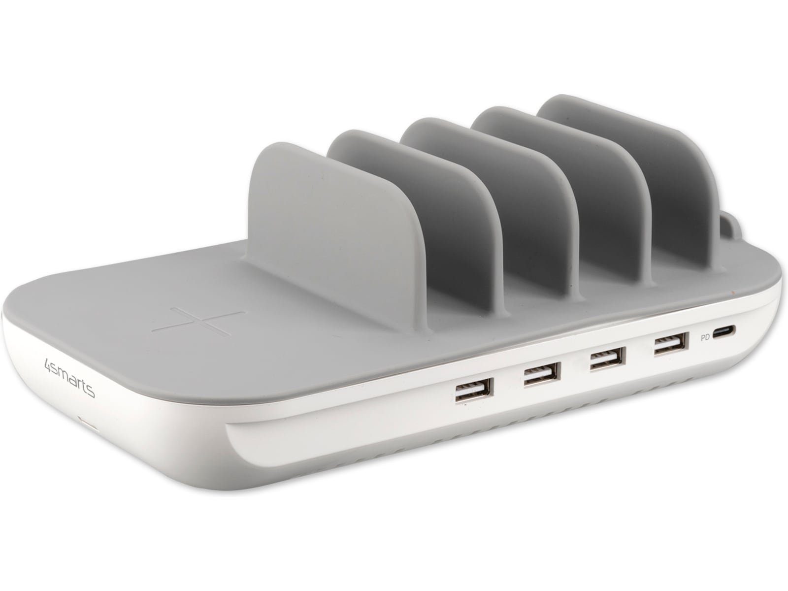 Mångsidigt: Kan ladda upp till 6 enheter samtidigt. Det spelar ingen roll om det du vill ladda är smartphones eller surfplattor. I laddstationens extra fack kan du till och med ladda ett TWS-headset som till exempel 4smarts Skypods eller Apple Airpods.