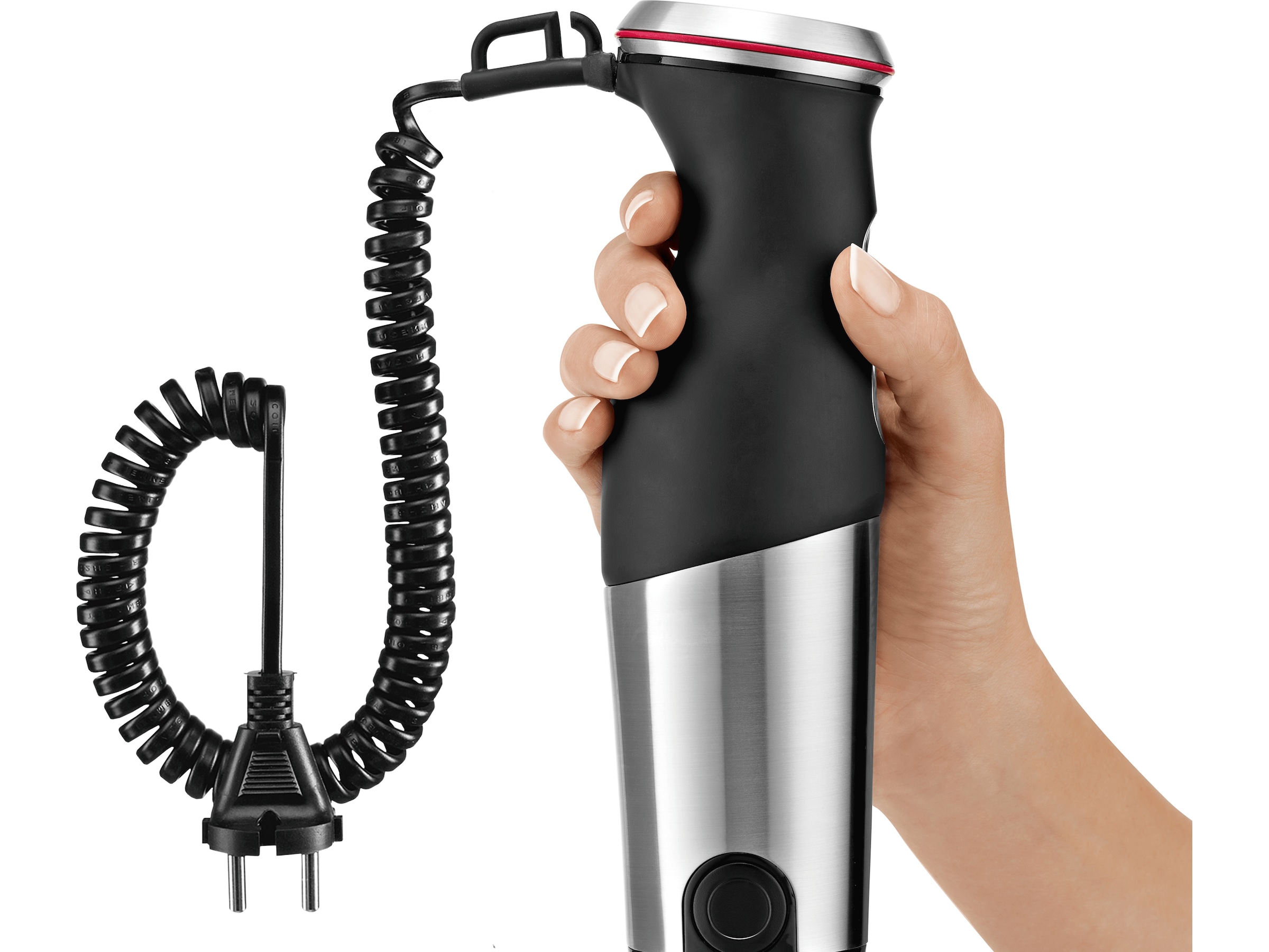 Det är en glädje att laga mat med den här handmixern. Höljet av rostfritt stål med gummerad yta ger både ett bekvämt och säkert grepp, även när du kör mixern på högsta hastighet. Stora knappar som är lättillgängliga för enkel användning.