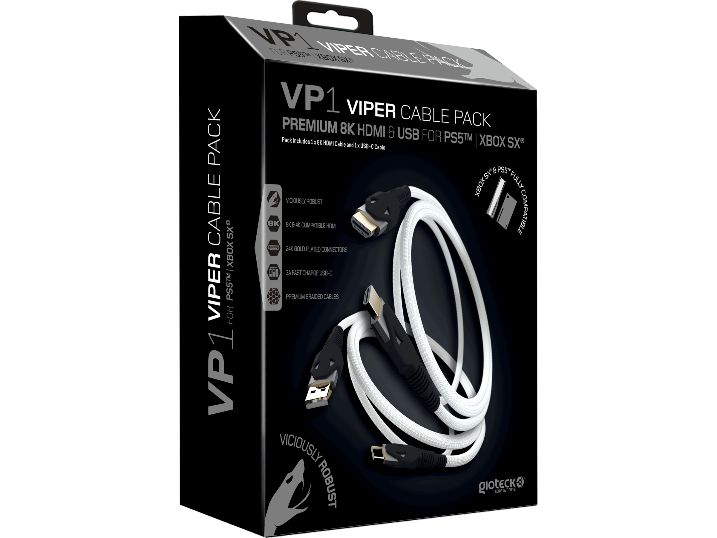 Gioteck Premium Cable Pack är en allt-i-ett-lösning för nästa generations konsoler och innehåller en Viper premium USB C-kabel (3m) och en premium 2.1 8K HDMI-kabel (2m).