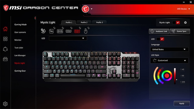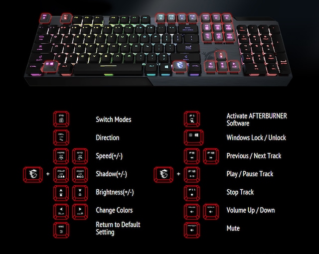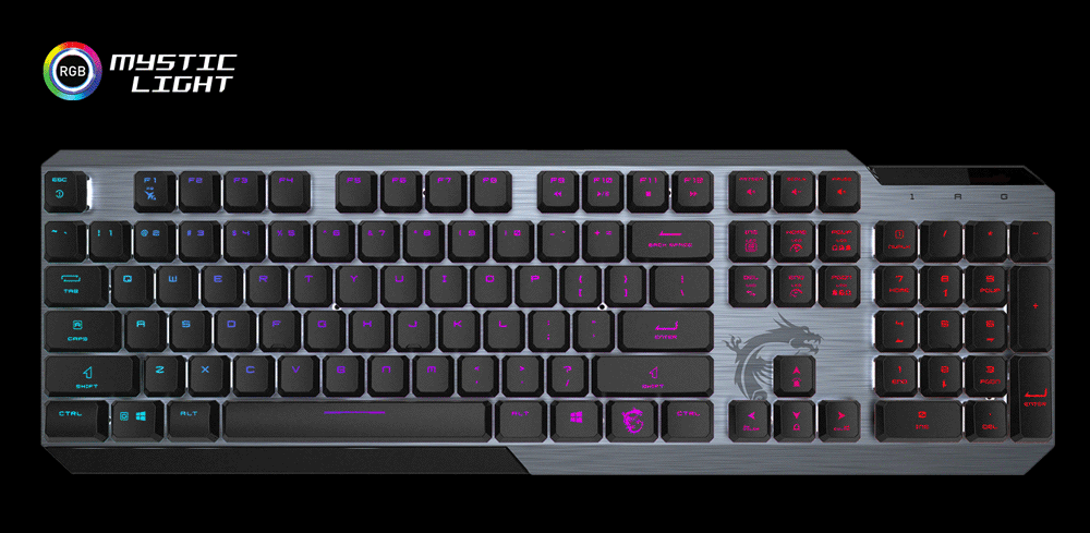 VIGOR GK50 LOW PROFILE kommer med miljontals färger och fantastisk RGB-belysning per tangent och olika effekter. Den skräddarsydda funktionen gör att du kan skapa olika och unika ljuseffekter via programvaran MSI Dragon Center.
