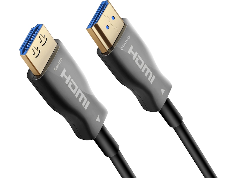 Iiglo AOC HDMI hybridkabel är riktad. Därför är det absolut nödvändigt att kabeln är ansluten åt rätt håll för att du ska få en bild. Anslut kontakten märkt "Display" till din TV, projektor eller bildskärm och kontakten märkt "Source" till din PC, Apple TV, etc.