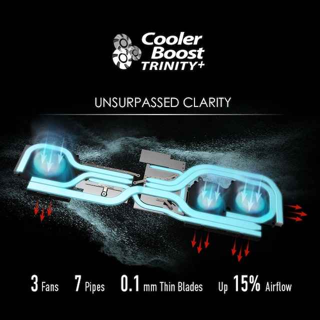MSI:s exklusiva Cooler Boost-teknik säkerställer en optimal värmeavledning. Med världens tunnaste 0,1 mm skarpkantade fläktbladsdesign förbättrar den nya Cooler Boost Trinity+ fläktens luftflöde och ger den bästa spelupplevelsen.