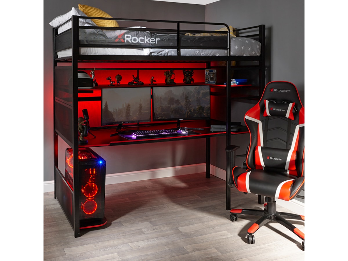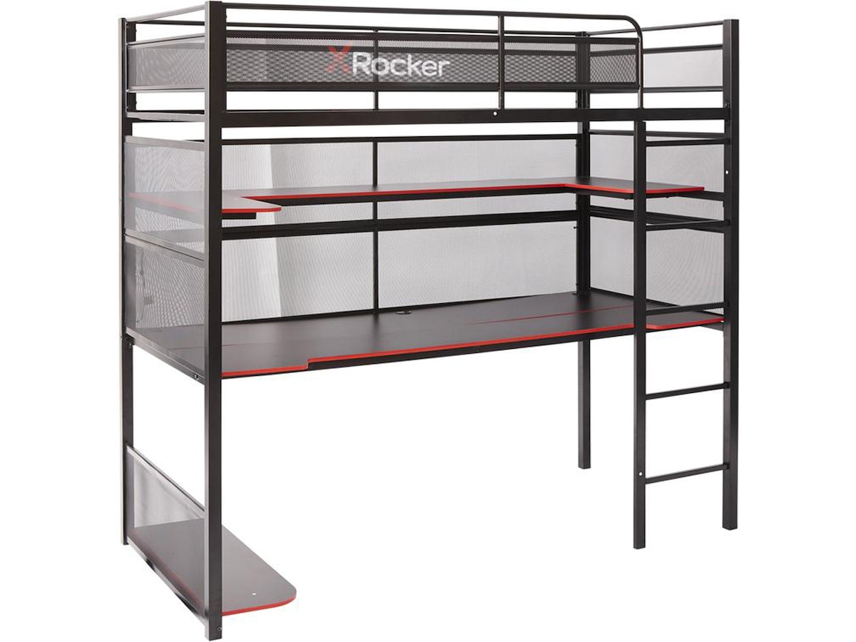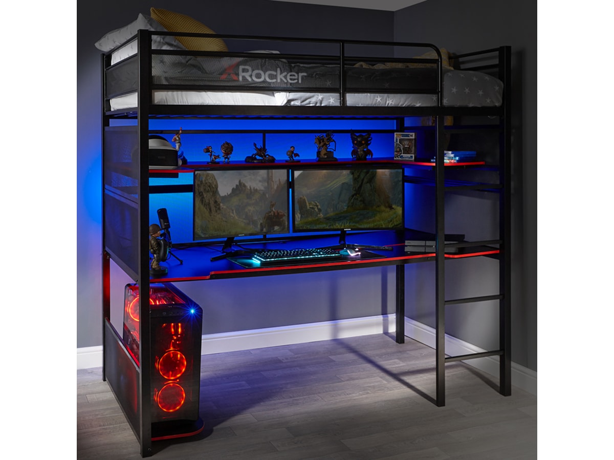 Ladda upp för seriös spelaction med denna fullastad X Rocker gamingsäng. Med enkelsängen undanstoppad ovanpå finns det massor av utrymme under för flera skärmar, tangentbord och en anständig gamingstol. Förvara filer och samlarföremål på de övre hyllorna tillsammans med kontroller och andra speltillbehör. Förvara större föremål under skrivbordet på bashyllan för att optimera ditt utrymme. Detta är en mångsidig och hållbar spelbordssänghybrid som är perfekt för yngre spelare.