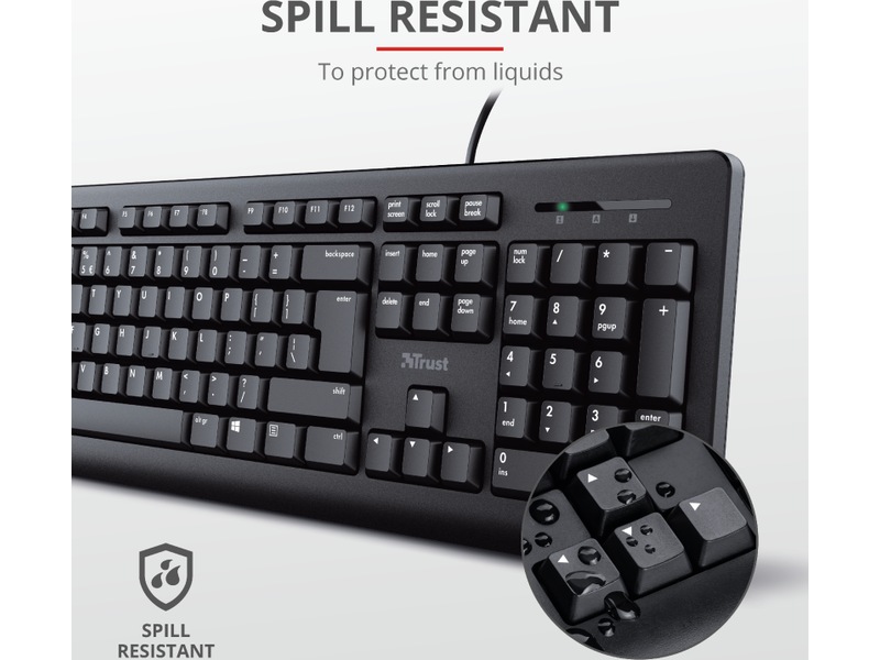 Ett bra tangentbord måste vara bekvämt att använda. Lågprofiltangenterna i detta tangentbord i full storlek och de utfällbara fötterna ger exakt den komfort du behöver för att fokusera på ditt arbete. Du behöver inte ens oroa dig för att spilla något på Primo, eftersom den spillresistenta designen gör att du kan fortsätta ditt arbete utan krångel. Häll upp en kopp kaffe och sätt igång.