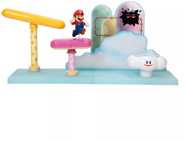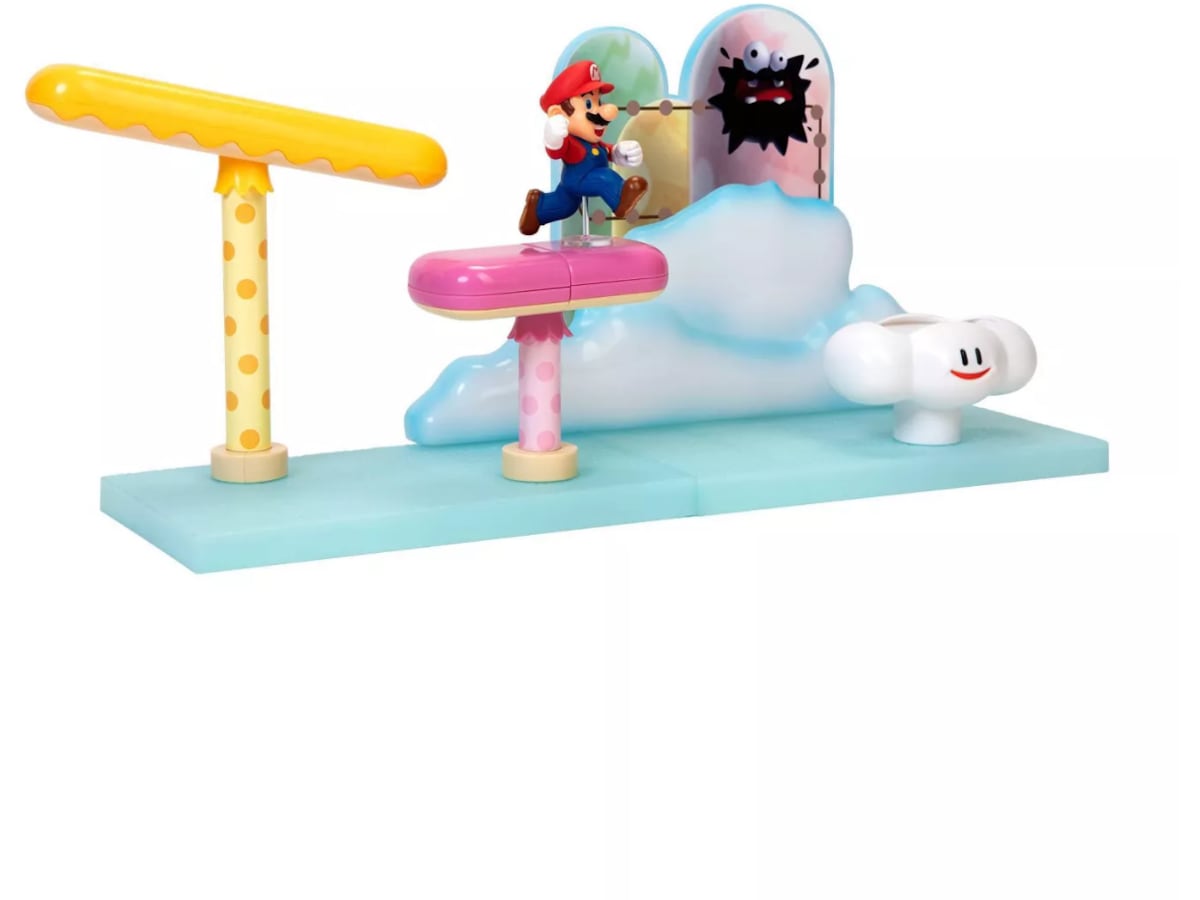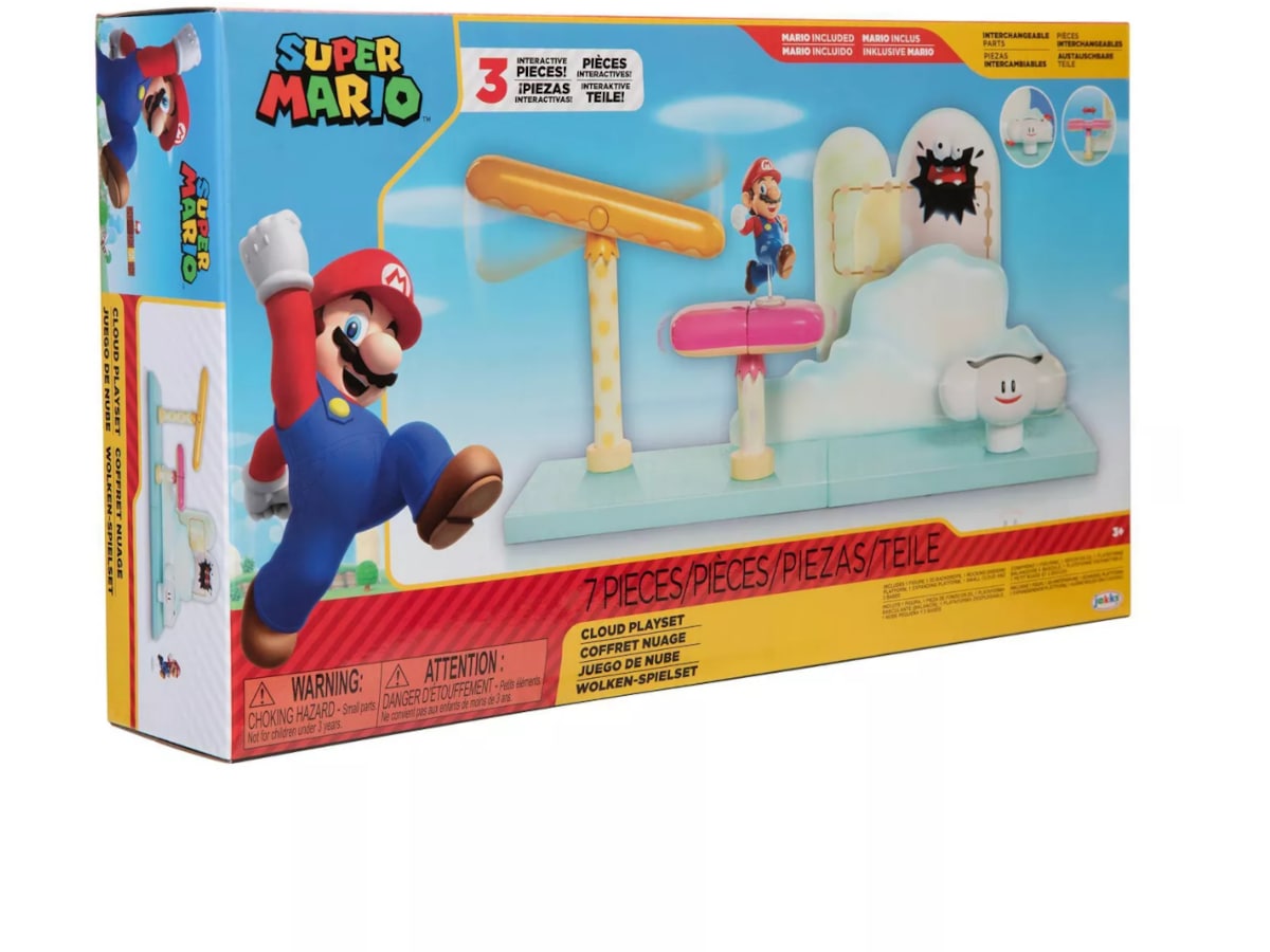 Super Mario - Playset Cloud Från Jakks Pacific. Fortsätt dina Super Mario-äventyr med Cloud Playset från den populära videospelsserien. Det här leksetet innehåller en mini-Mario-figur och ett slott med flagga precis som i slutet av varje nivå i spelet!
