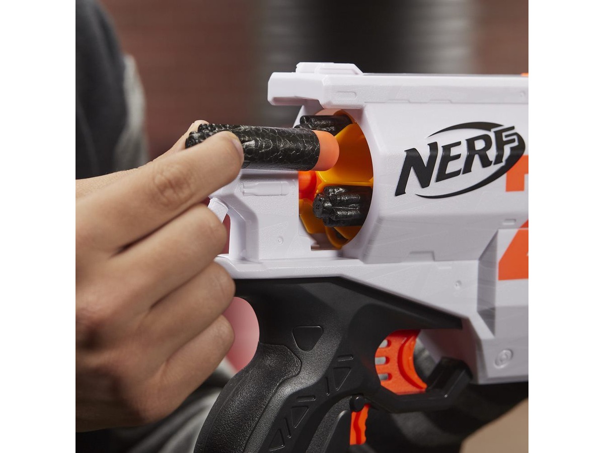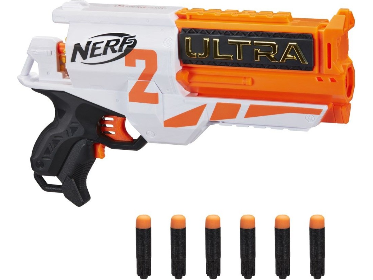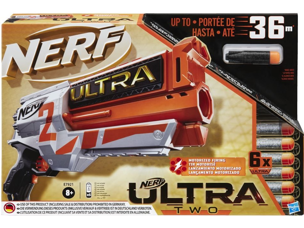 Nerf Ultra Two motoriserade blaster har snabb omaddning. Blastern har en 6-darts cylinder som är öppen baktill, vilket gör att du kan se inuti cylindern när du håller i blastern för att elda. Denna design ger dig två fördelar i strid: du kan enkelt se hur många pilar som finns kvar i cylindern så att du vet när du ska ladda om, och du kan snabbt och enkelt sätta in pilar i cylindern för att ladda om snabbt medan du är på flytta. Cylindern har en kapacitet på 6 pilar, och sprängaren kommer med 6 Nerf Ultra-pilar, den längst flygande Nerf-pilen någonsin. Blastern är endast kompatibel med Nerf Ultra dart.