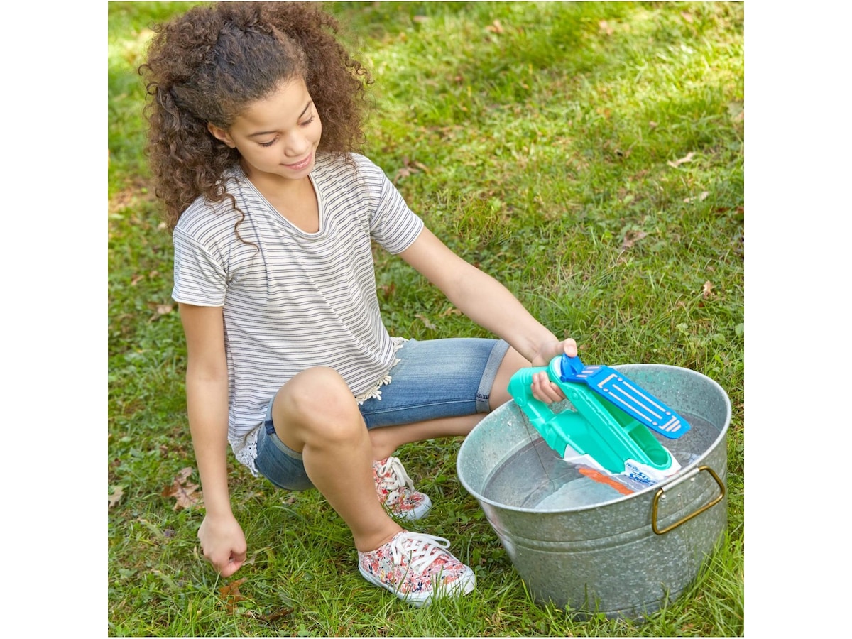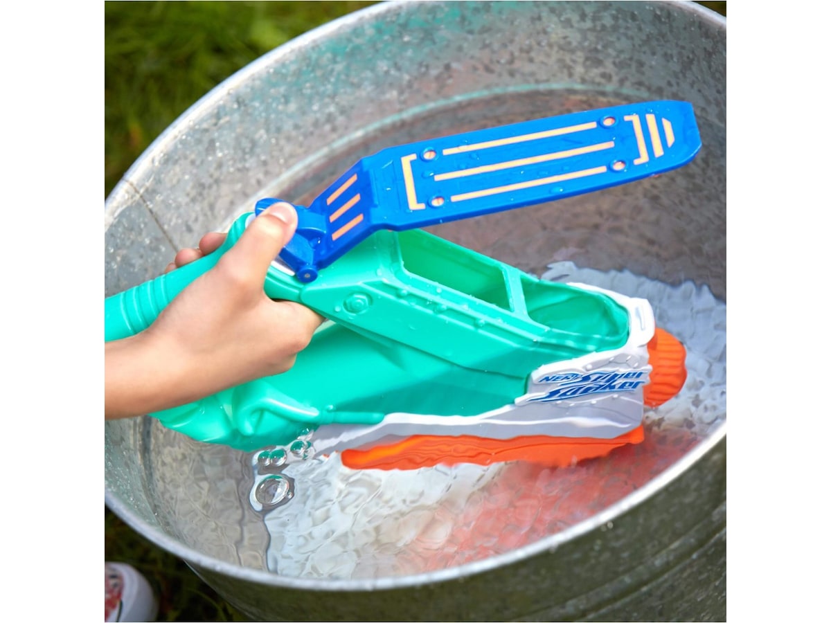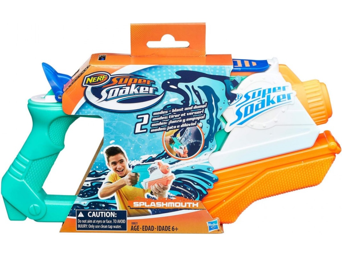 Nerf Super Soaker Splash Mouth vattenblastern har två lägen för att avfyra vatten. Krigare kan pumpa för att avfyra en ström av vatten, eller öppna luckan och avfyra allt vatten i en enorm våg.