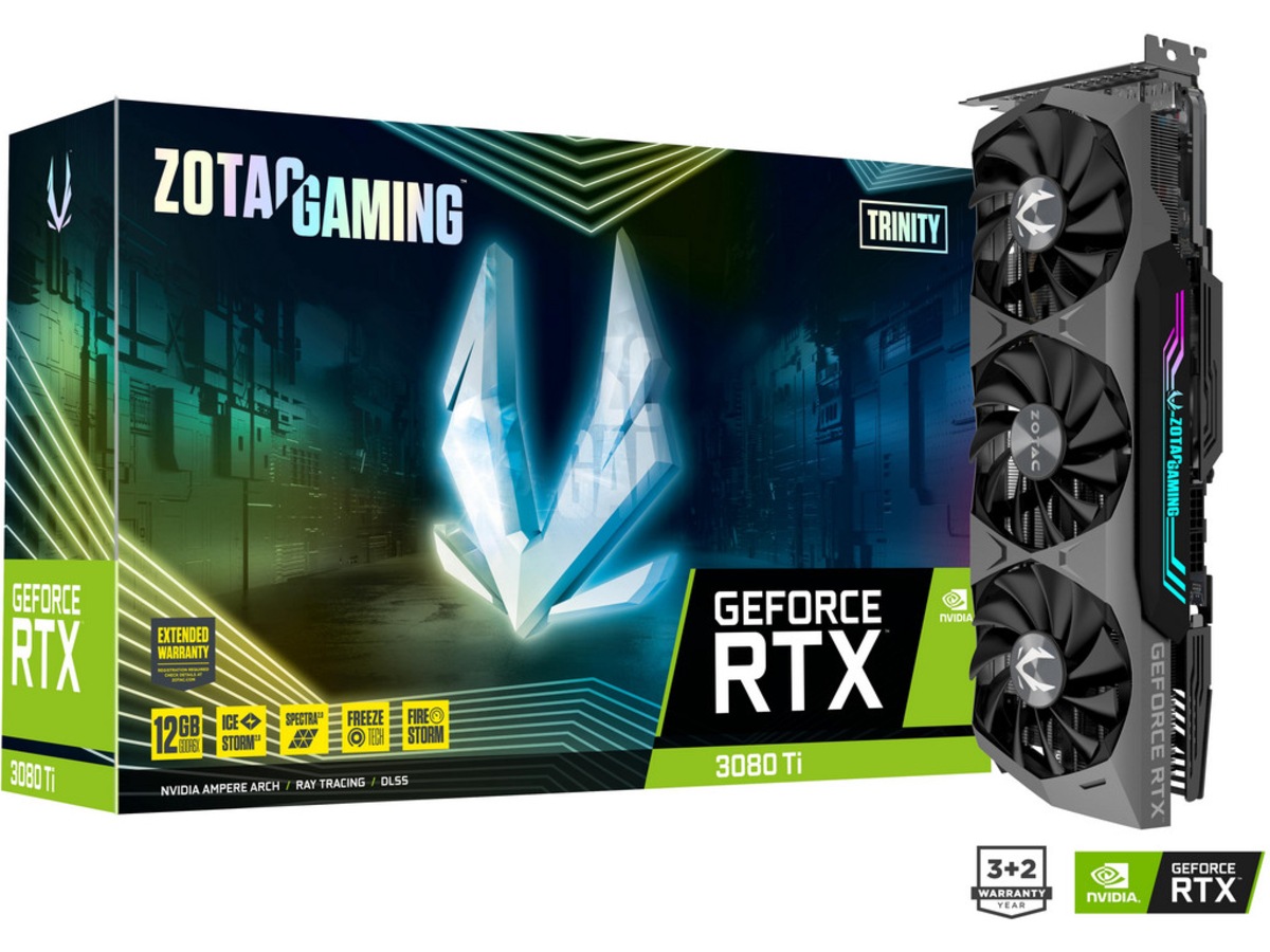 ZOTAC GeForce RTX 3080 Ti Trinity Njut av ultraprestanda i de senaste speltitlarna och förstärk din spelupplevelse med ZOTAC GAMING GeForce RTX™ 3080 Ti Trinity. Den finjusterade balansen mellan kylning, akustik och estetik hos ZOTAC GAMING-grafikkortet ger en extremt hög grafiktrohet för spel.