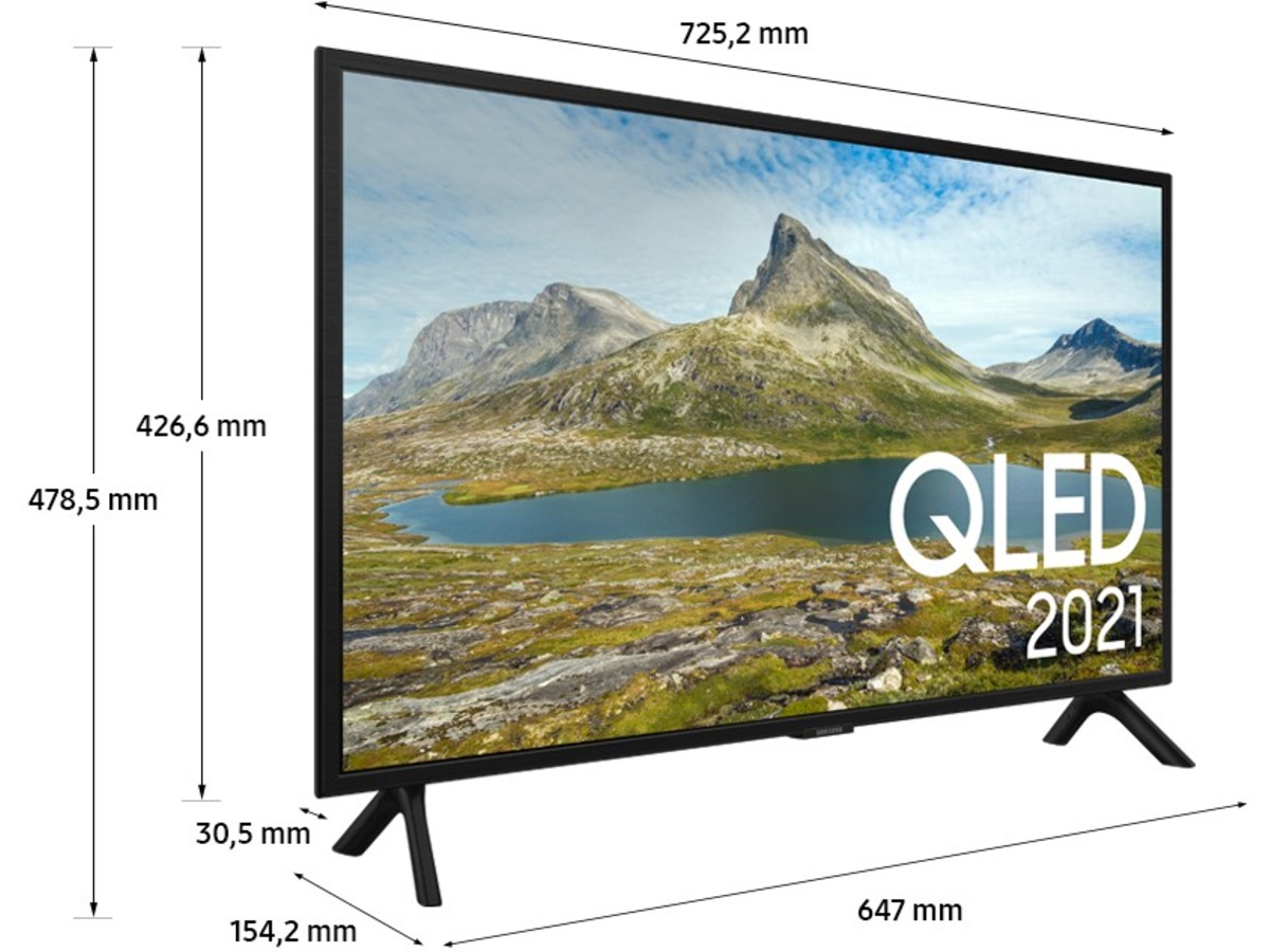 TV-bänk - 64.7 cm x 15.42 cm, Skärm med ställ - 72.52 cm x 15.42 cm x 47.85 cm x 5.4 kg, Skärm utan ställ - 72.52 cm x 3.05 cm x 42.66 cm x 5.3 kg