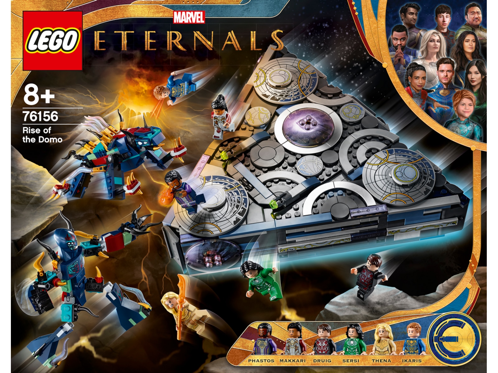 - Byggleksaken LEGO® Marvel Domo lyfter (76156) tar med barn in i Eternals rymdskepp och låter dem leka rollekar om oändliga strider med superhjälteminifigurer och Deviant-varelser.