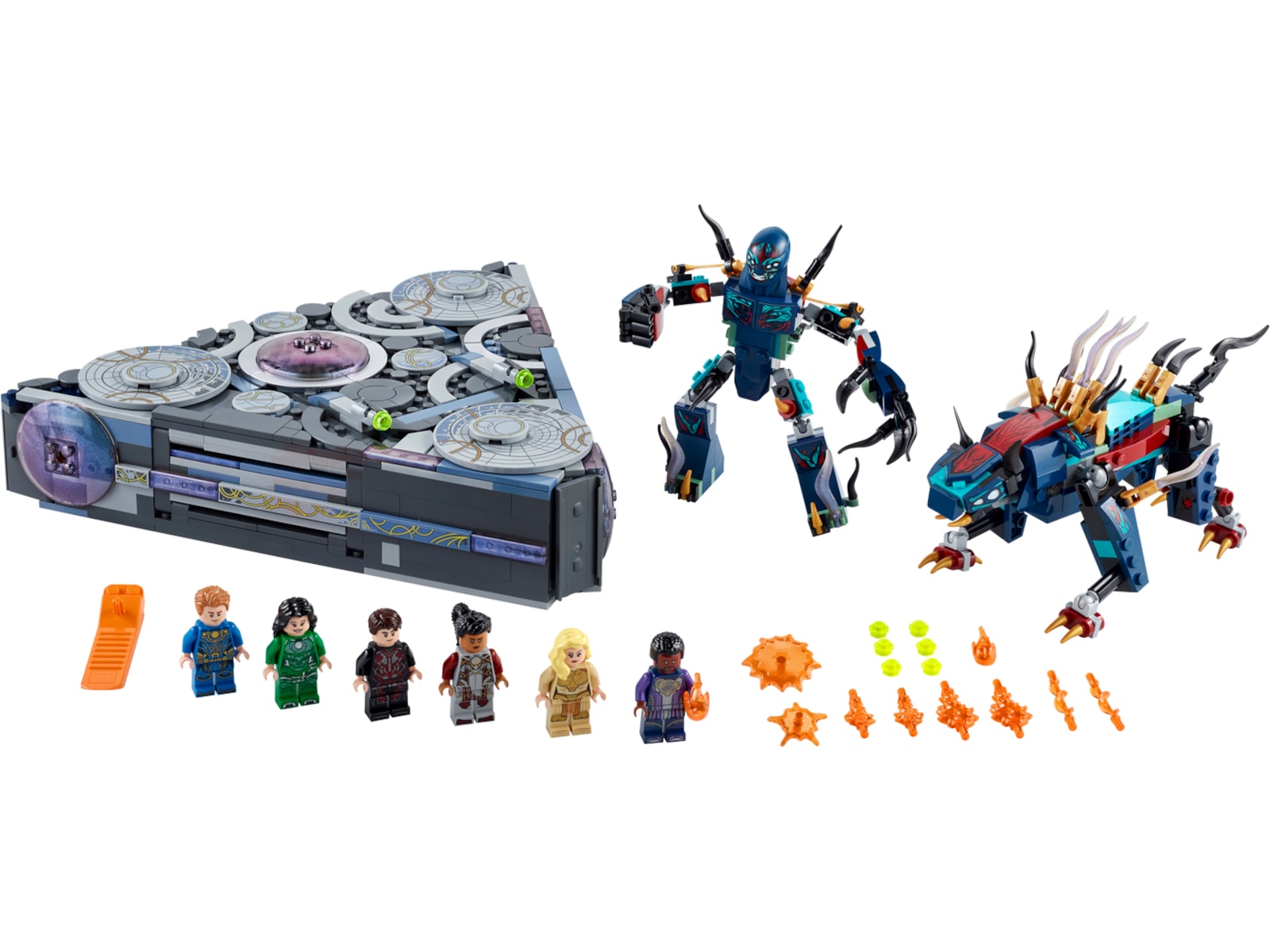 - Med 6 minifigurer – Makkari, Ikaris, Thena, Sersi och de exklusiva Druig och Phastos – 2 Deviant-actionfigurer, inklusive Deviants ledare Kro, rymdskepp, vapen och tillbehör.