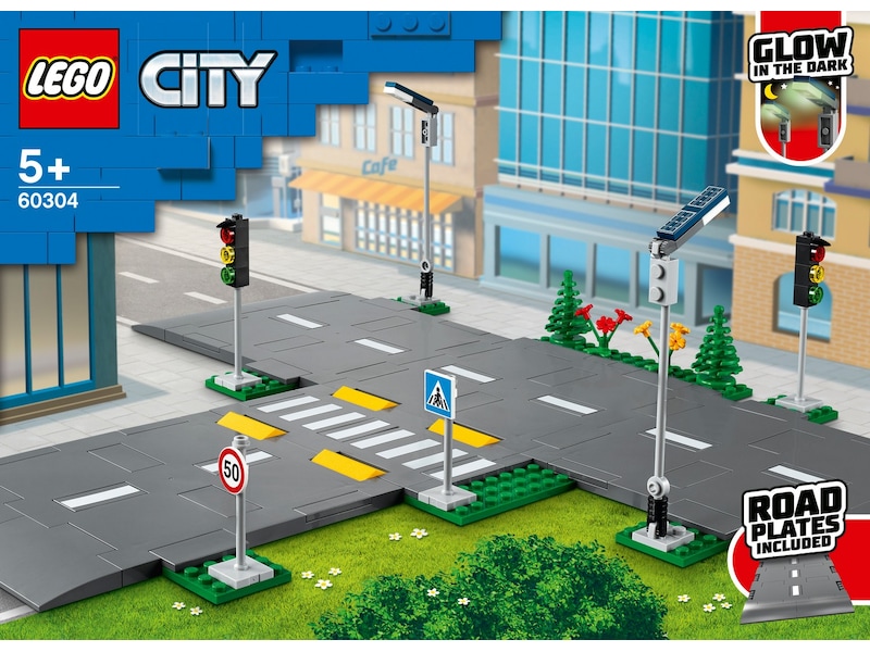 - Vad finns i lådan? Barn får 5 LEGO® vägplattor med trafikmarkeringar, farthinder och ett övergångsställe, plus gatlyktor som lyser i mörkret, leksakstrafikljus, vägskyltar, träd och grönska.