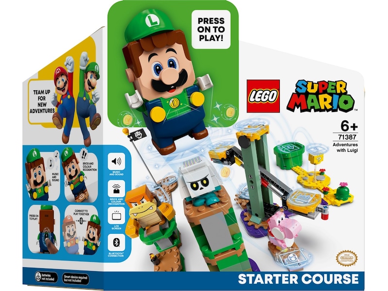 En grym present till trendmedvetna barn, med en LEGO® Luigi™ figur som ger omedelbara, uttrycksfulla svar via en LCD-skärm och högtalare. Spelare tjänar digitala mynt genom att hjälpa LEGO Luigi att klara flygutmaningen och den snurrande gungbrädan, interagera med rosa Yoshi och besegra Boom Boom och en Bone Goomba. ?-blocket ger också belöningar. Samarbete är roligt Barn kan spela på egen hand eller med en vän och koppla ihop sin LEGO Luigi med kompisens LEGO® Mario™ (extra figurer ingår inte) via Bluetooth för att tjäna bonusmynt för samarbete. Du hittar bygginstruktioner i gratisappen LEGO Super Mario. Obegränsade möjligheter LEGO Super Mario samlarseten erbjuder ett nytt sätt att leka, i den verkliga världen, med ikoniska karaktärer från Super Marios värld. Startbanan och expansionsseten, plus boostpaketen, kan kombineras på oändliga sätt så att fans kan bygga sina egna banor.